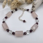 Bryłki kwarcu różowego mają wymiary ok. 7x10 mm, kulki kryształu górskiego - 6 mm a granatu 4,5 mm. Dodatki z hematytu mają średnicę około 3 mm.