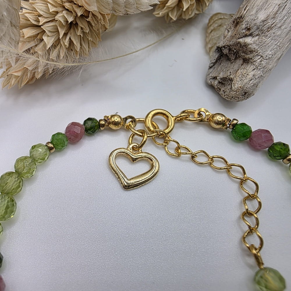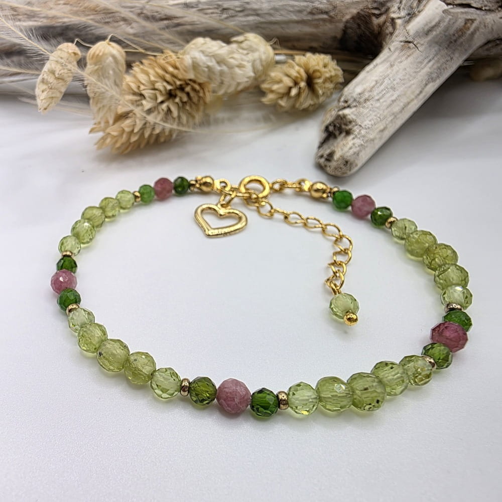 Delikatna i subtelna bransoletka - amulet z kamieni naturalnych idealnych dla kobiet - podkreślających najwspanialsze cechy kobiece i zapewniających to, czego każda kobieta potrzebuje. Kompozycja w pięknych odcieniach mieniącej się zieleni i ciemniejszego różu dzięki wykorzystanym w niej kamieniom ma cudowne magiczne właściwości.