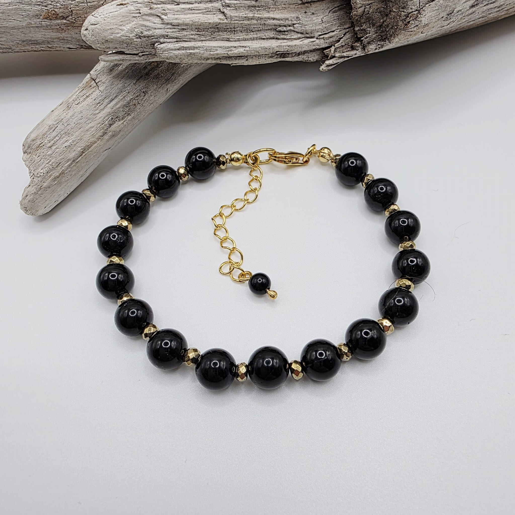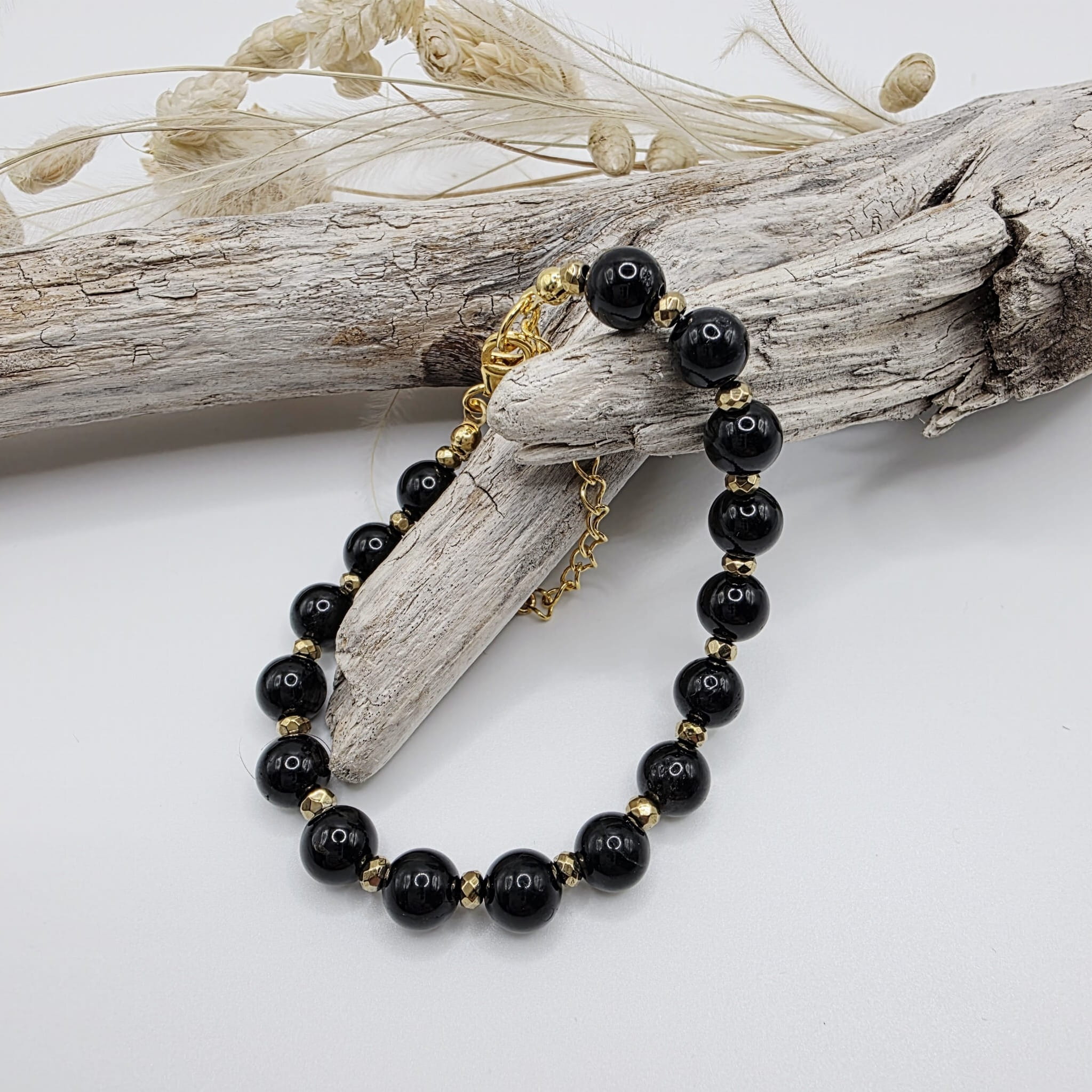 Klasyczna bransoletka damska z czarnego turmalinu przeplatanego złotym hematytem - elegancka i stylowa