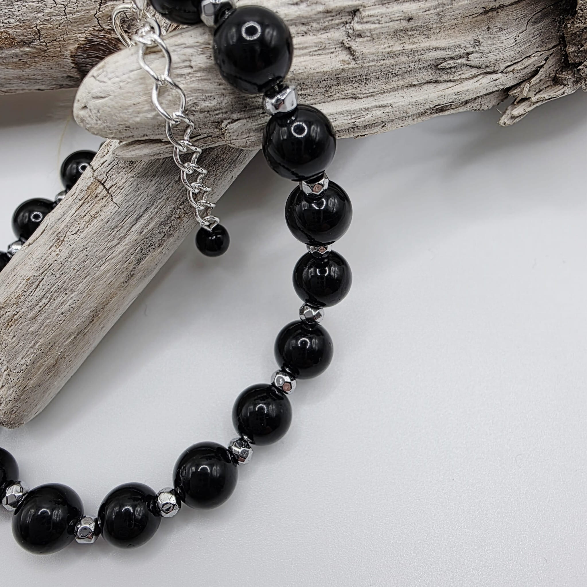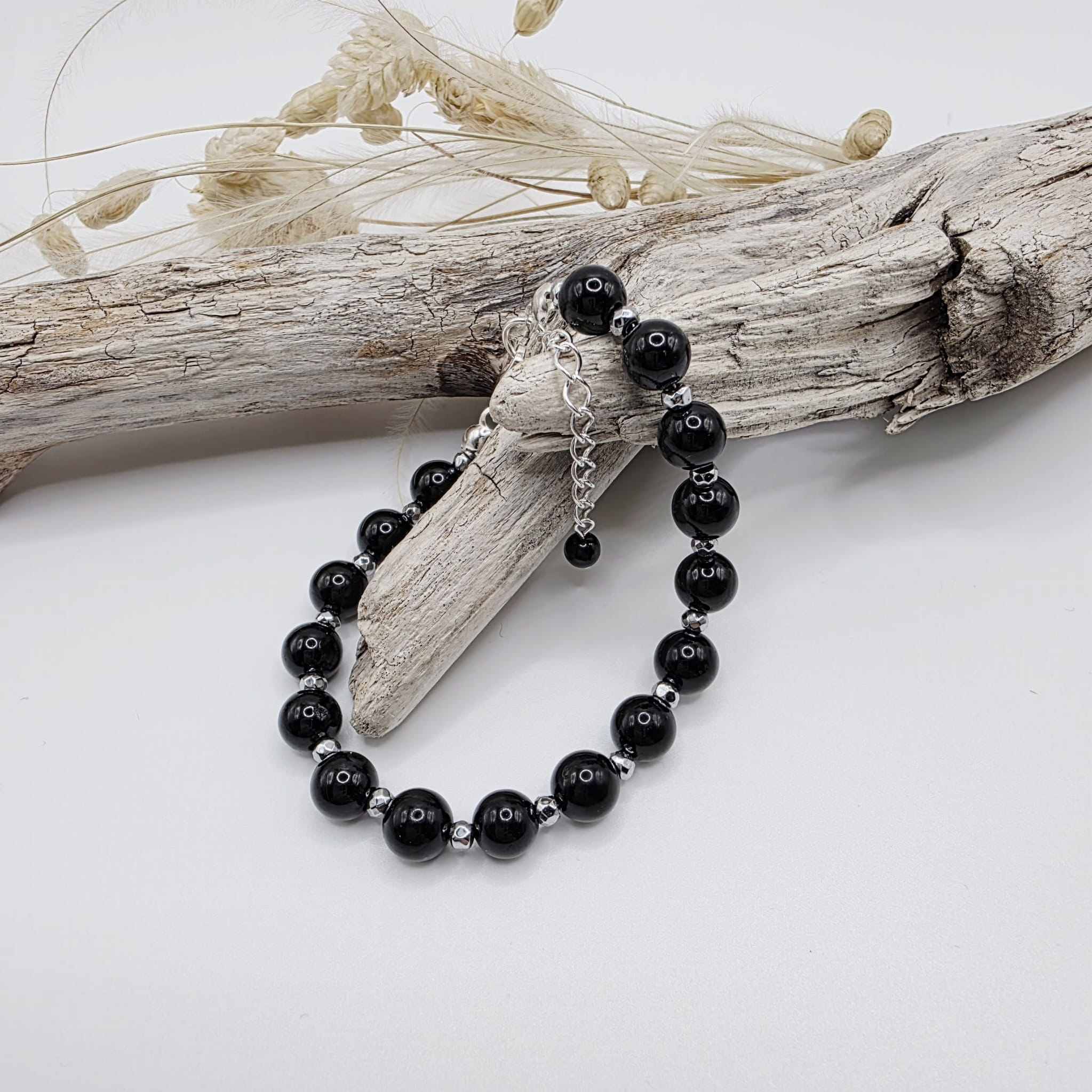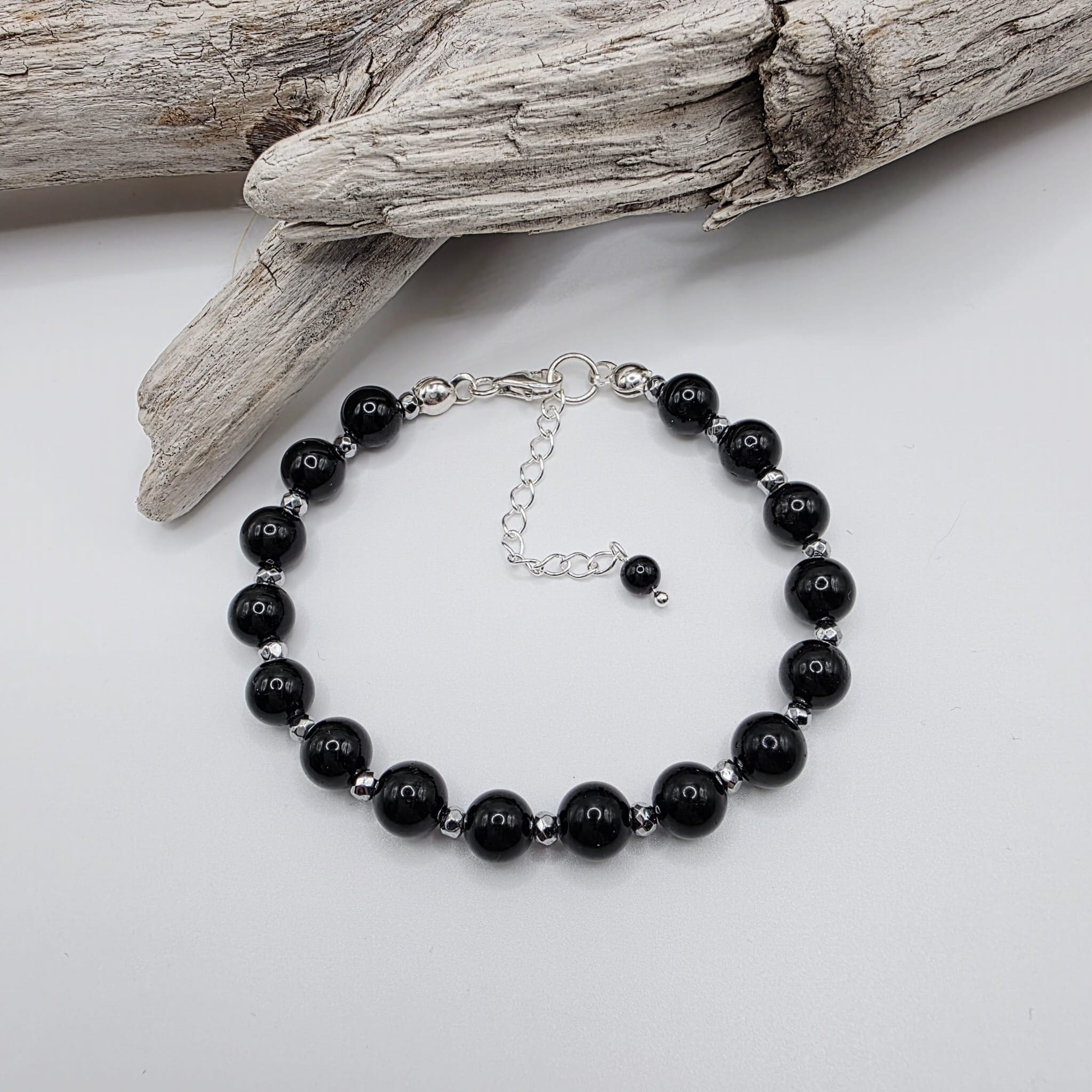 Klasyczna bransoletka damska z czarnego turmalinu przeplatanego srebrnym hematytem - elegancka i stylowa