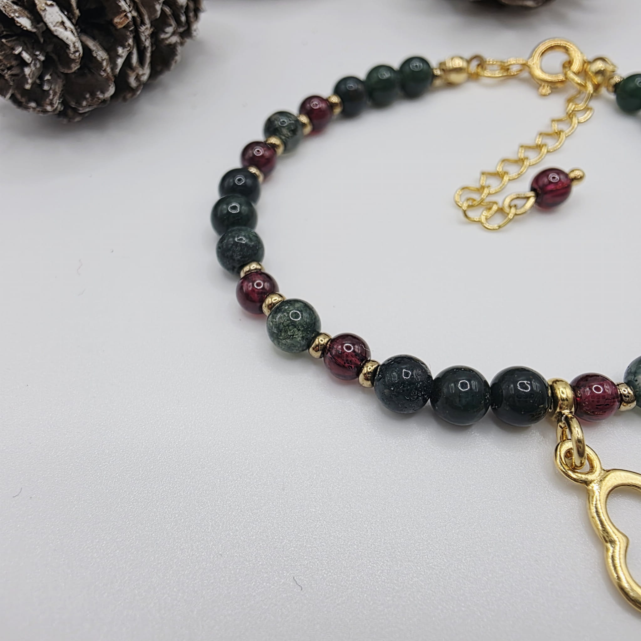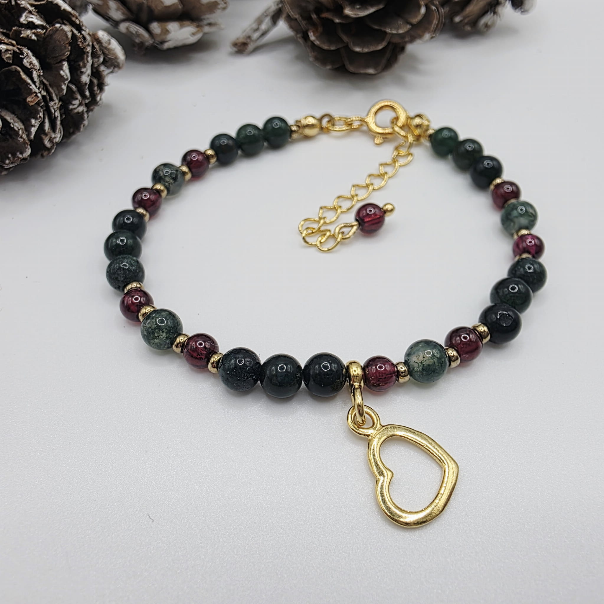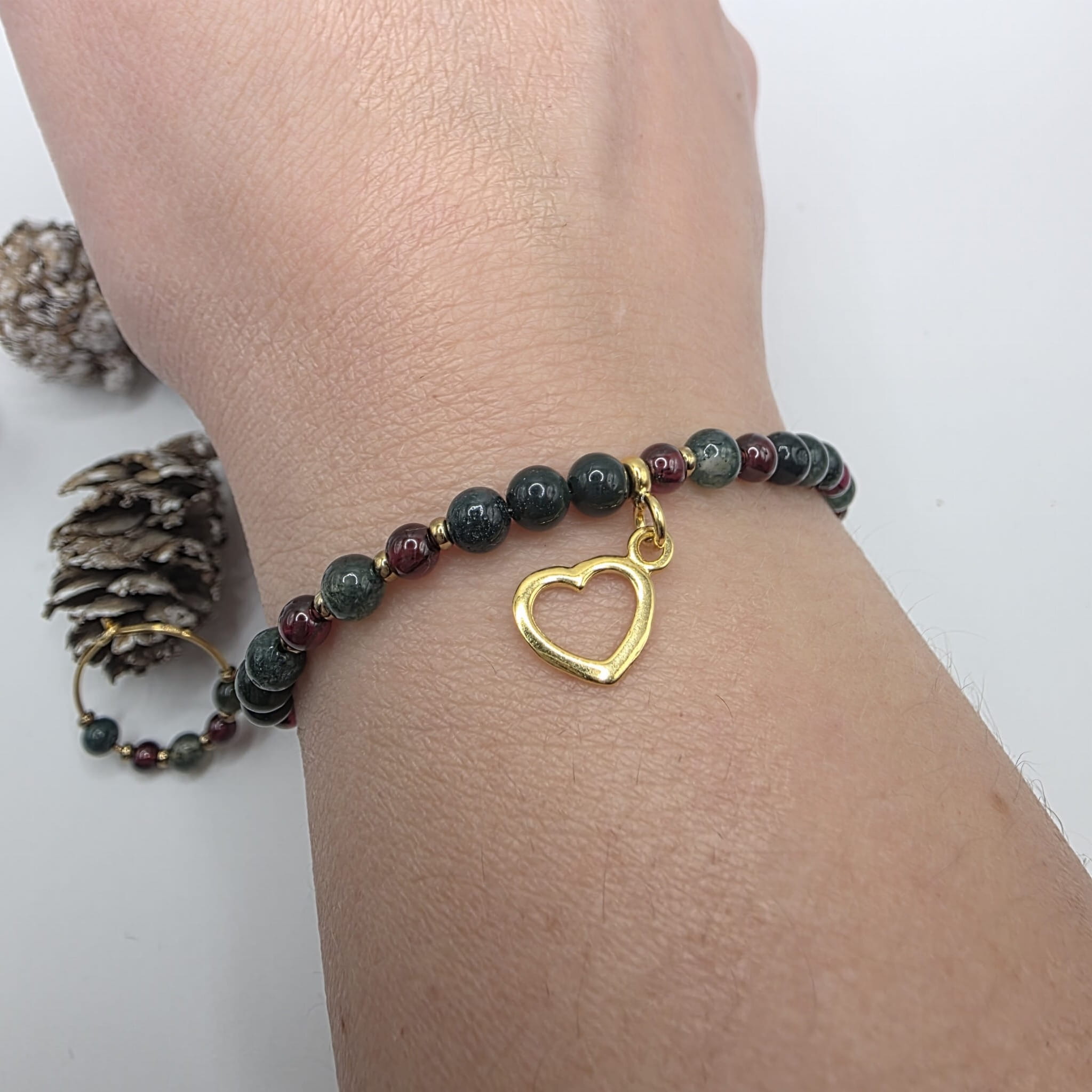 Delikatna bransoletka z kamieni naturalnych - agatu mszystego, granatu i hematytu - to świąteczne kolory w harmonijnej kombinacji łączącej pasję ze stabilnością: