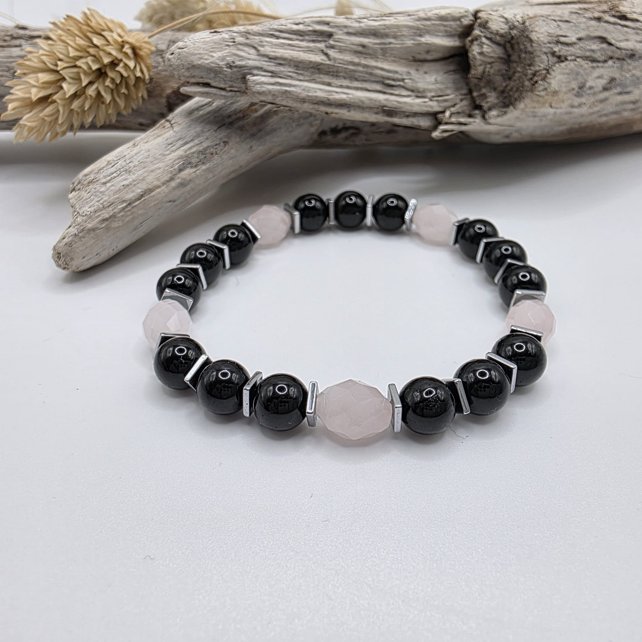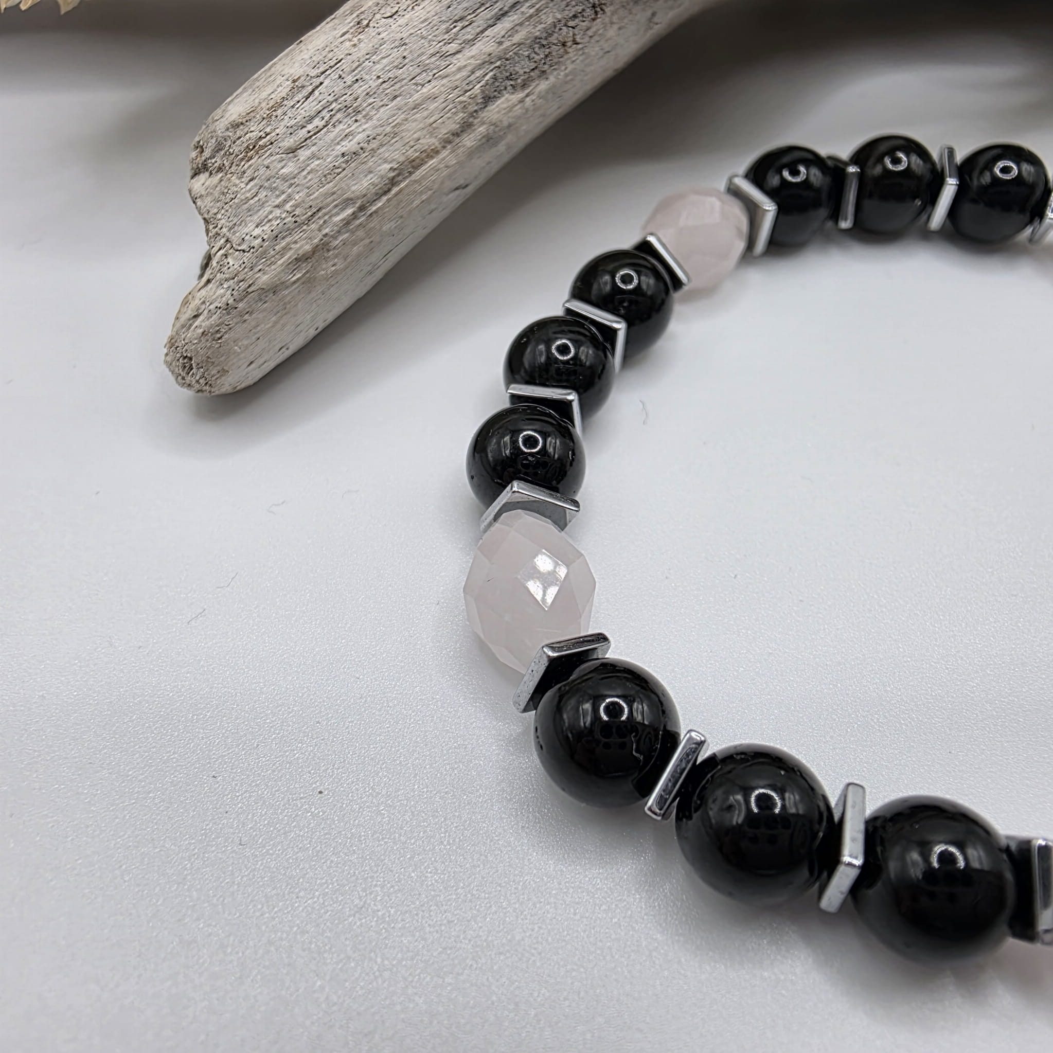 Wyjątkowa bransoletka z kamieni naturalnych - czarnego turmalinu i kwarcu różowego przeplatanych srebrnym hematytem - pełna uroku i magicznej niezwykłej mocy: