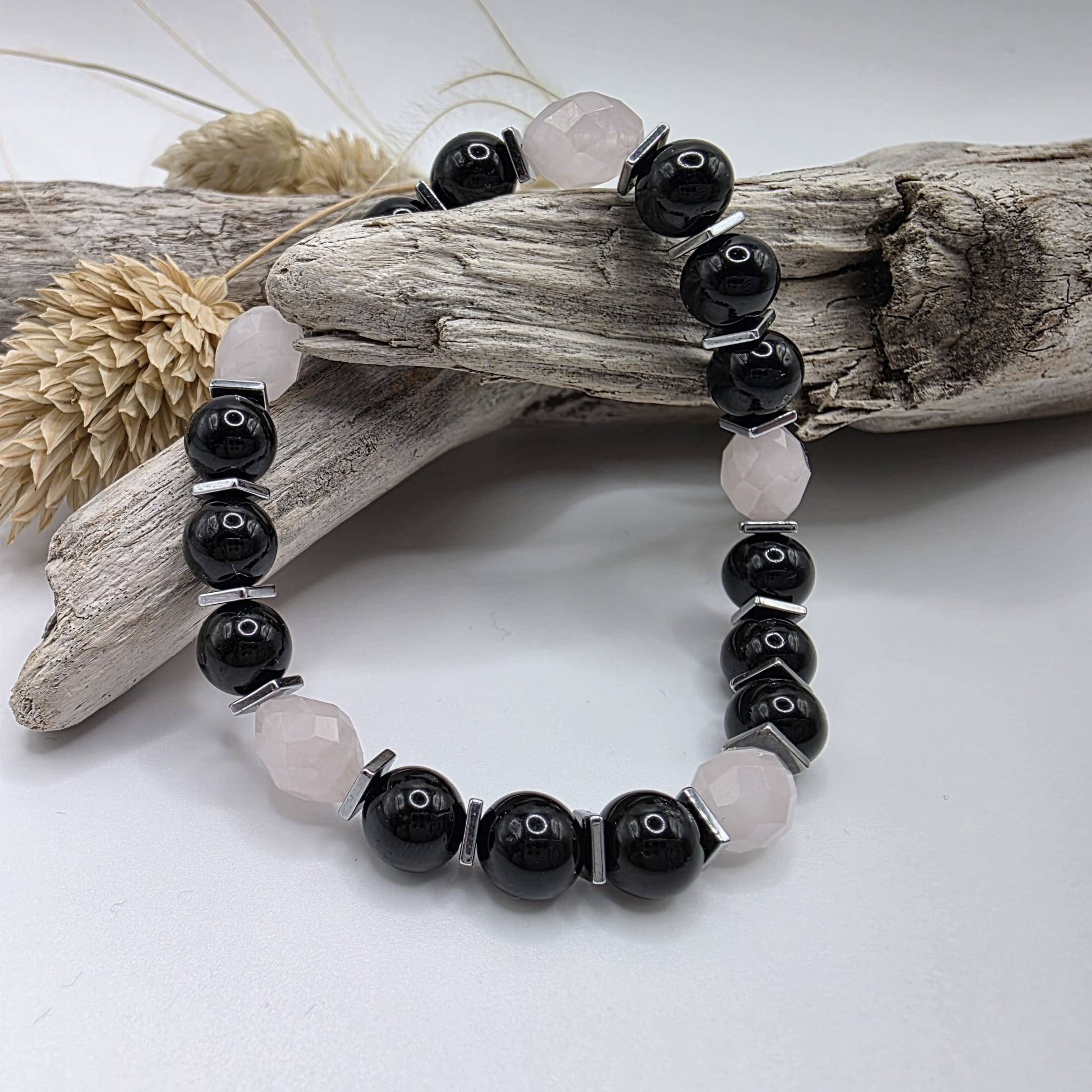 Połączenie kwarcu różowego z czarnym turmalinem tworzy harmonijną kombinację, która równoważy ochronę z miłością i pomaga w budowaniu zdrowych relacji oraz poczucia własnej wartości. Bransoletka będzie idealna dla osób pracującaych nad związkiem, ponieważ czarny turmalin zapewnia ochronę przed negatywną energią a kwarc różowy wspiera miłość i empatię, pomaga otworzyć się na innych, zbudować zaufanie i harmonijne relacje.