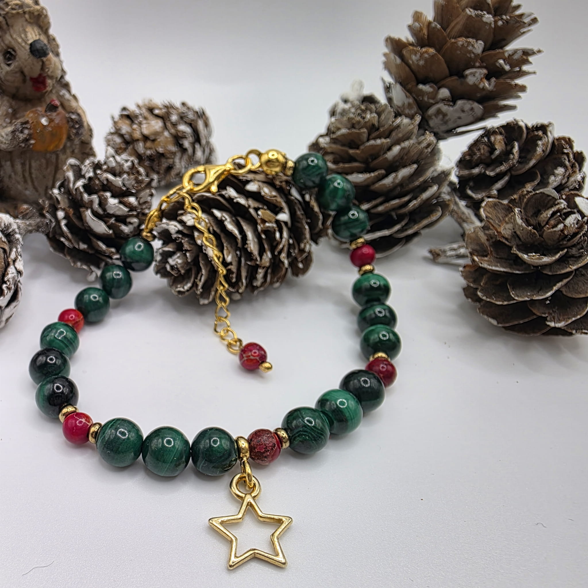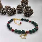 Kulki malachitu mają średnicę 6 mm, jaspisu - 4 mm. Wszystkie okucia, łańcuszek przedłużkowy oraz zawieszka - gwiazdka wykonane są ze srebra próby 925 pozłacanego 24-karatowtm złotem.