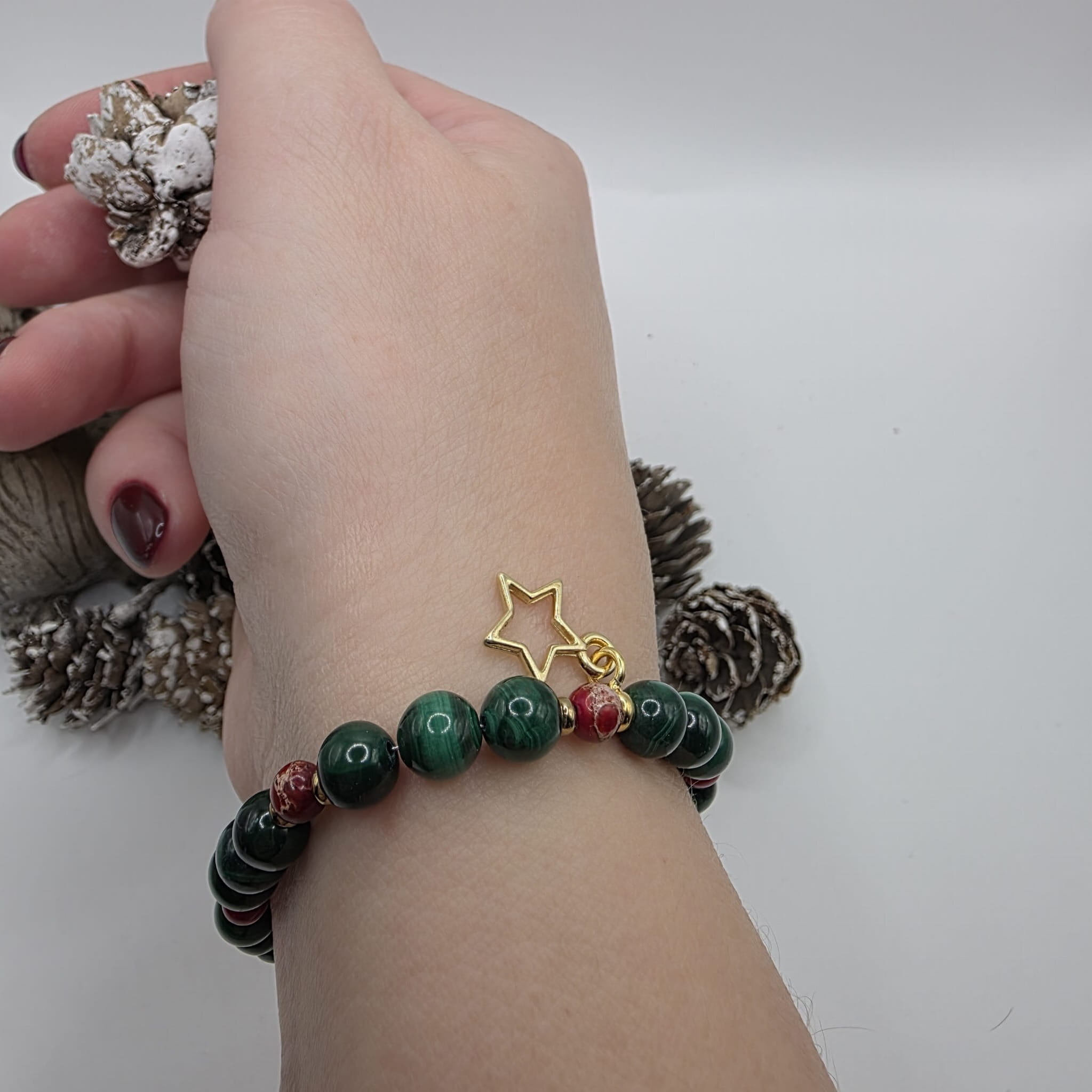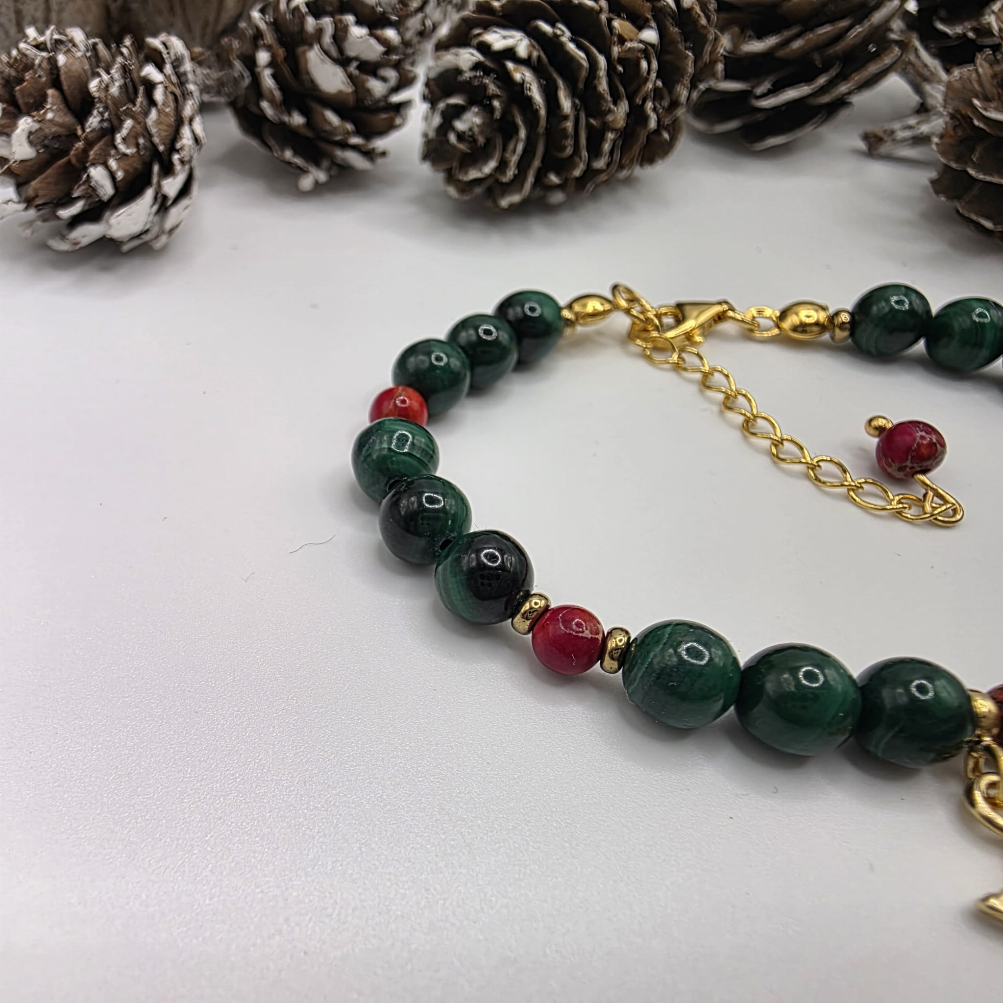 Bransoletka z malachitu i jaspisu przeplatana złotym hematytem - świąteczne kolory harmonizujące energię serca i ziemi, wspierające równowagę emocjonalną i zakorzenienie: