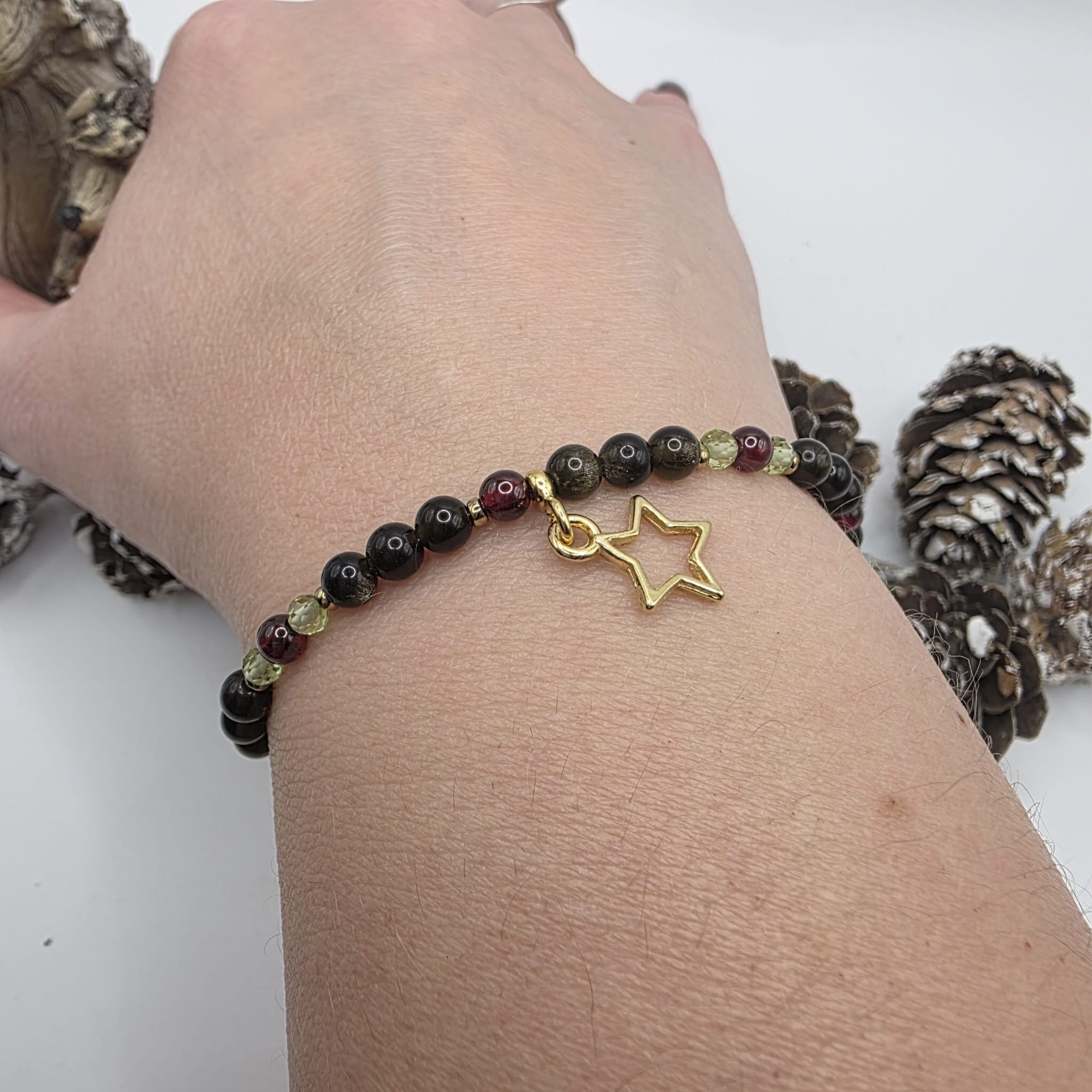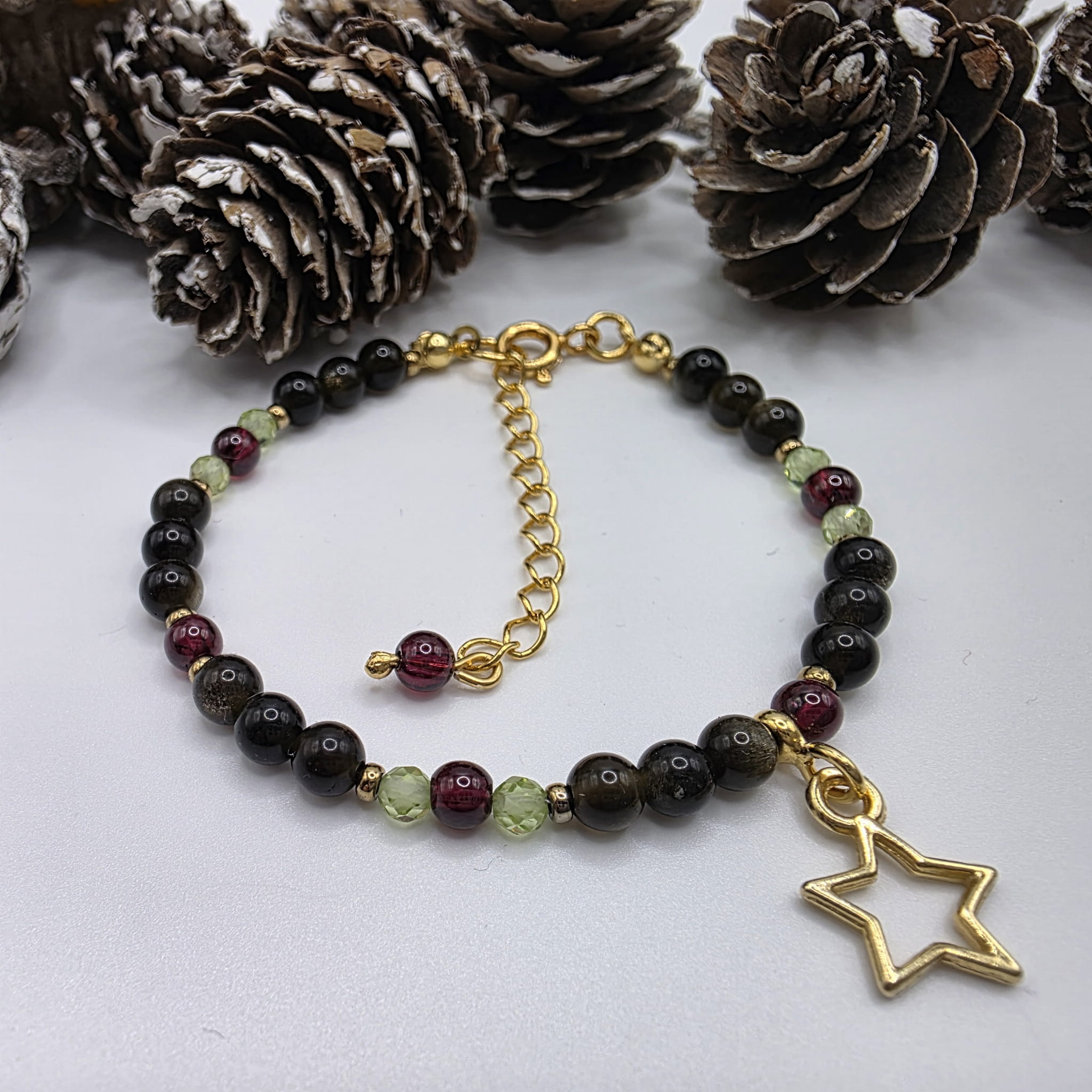 Delikatna i subtelna bransoletka z kamieni naturalnych z świątecznym akcentem w formie zawieszki - gwiazdki pełna złocistego połysku, dzięki wybranym do niej kamieniom tworzy unikalną synergię, która łączy w sobie silną ochronę, energię witalną oraz harmonię i uzdrowienie emocjonalne: