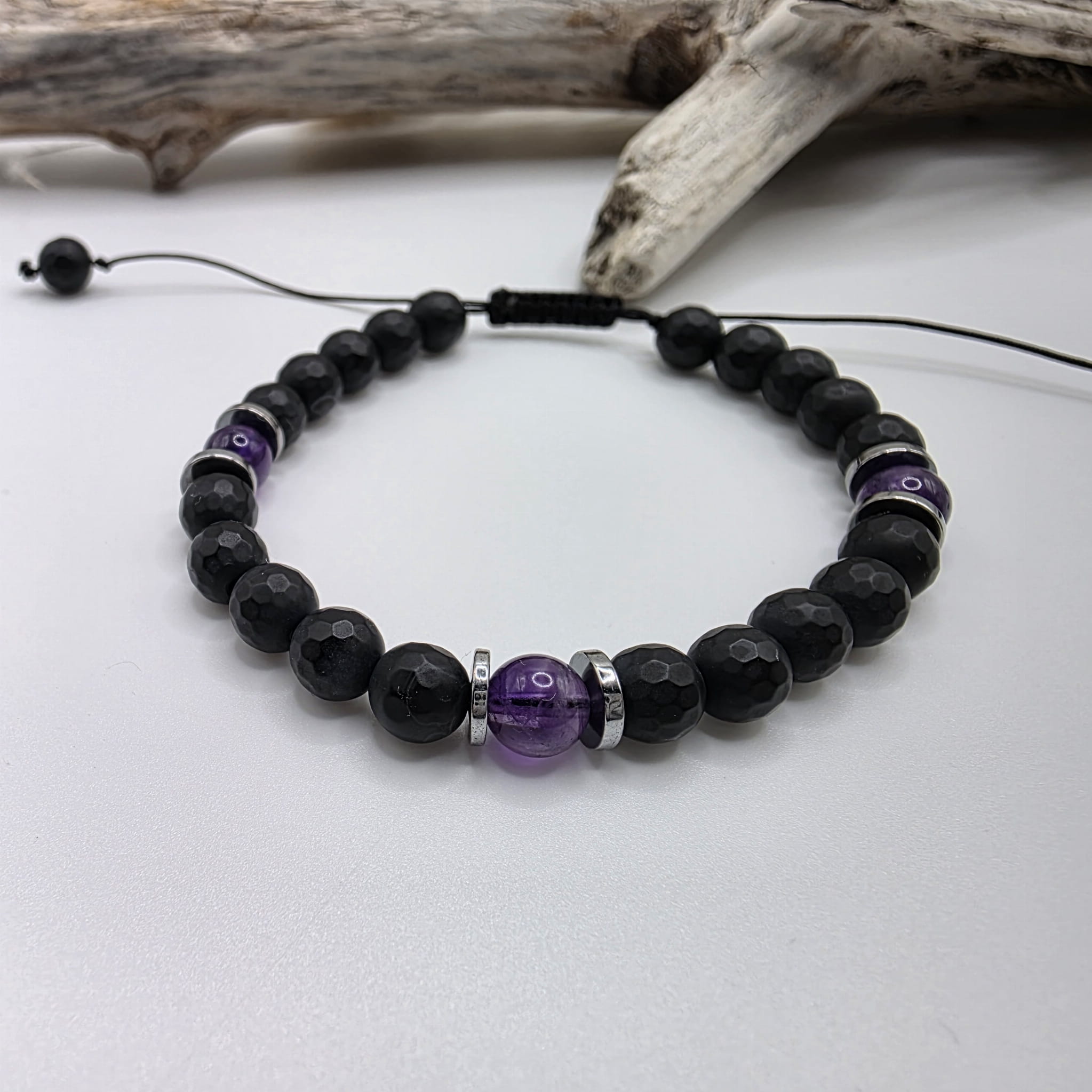 Bransoletka jest wykonana na sznurku - długość regulowana. Będzie pasowała na nadgarstek od 14 cm obwodu. Kulki matowego onyksu i połyskującego ametystu mają średnicę 6 mm.