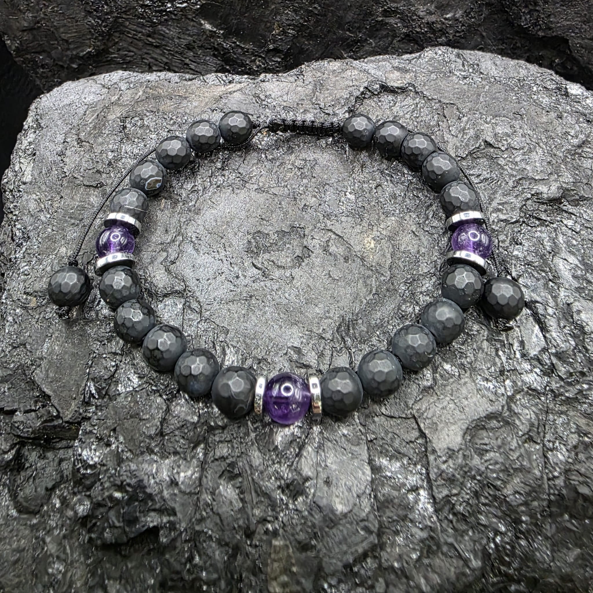 Bransoletka damska z kamieni naturalnych - onyksu, ametystu i hematytu - doskonałe połączenie siły i spokoju: