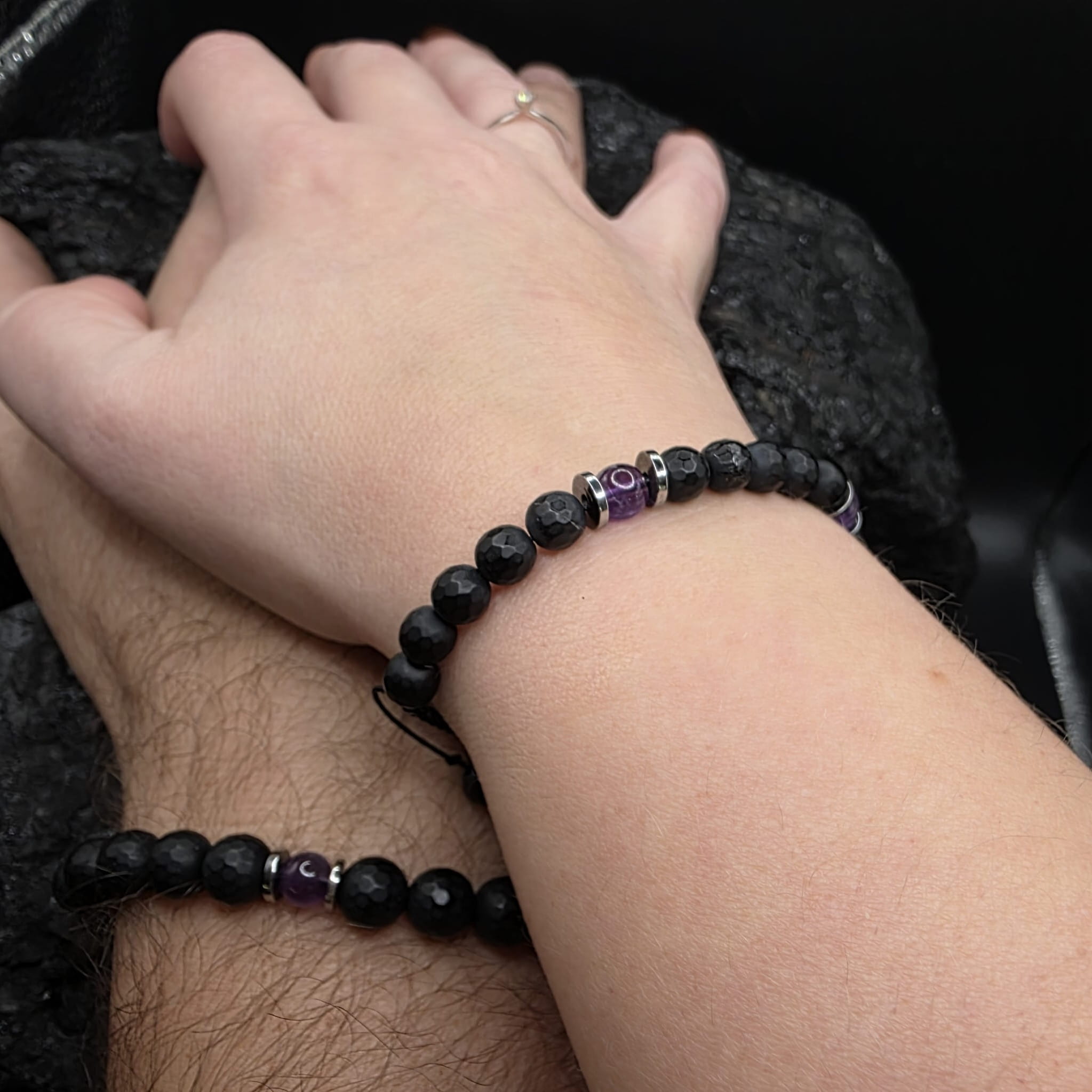 Połączenie onyksu i ametystu tworzy silny talizman ochronny, łączący ugruntowującą energię onyksu z uspokajającym i duchowym działaniem ametystu. Wspiera zarówno siłę fizyczną jak i psychiczną, zapewnia spokój umysłu oraz sprzyja rozwojowi duchowemu.