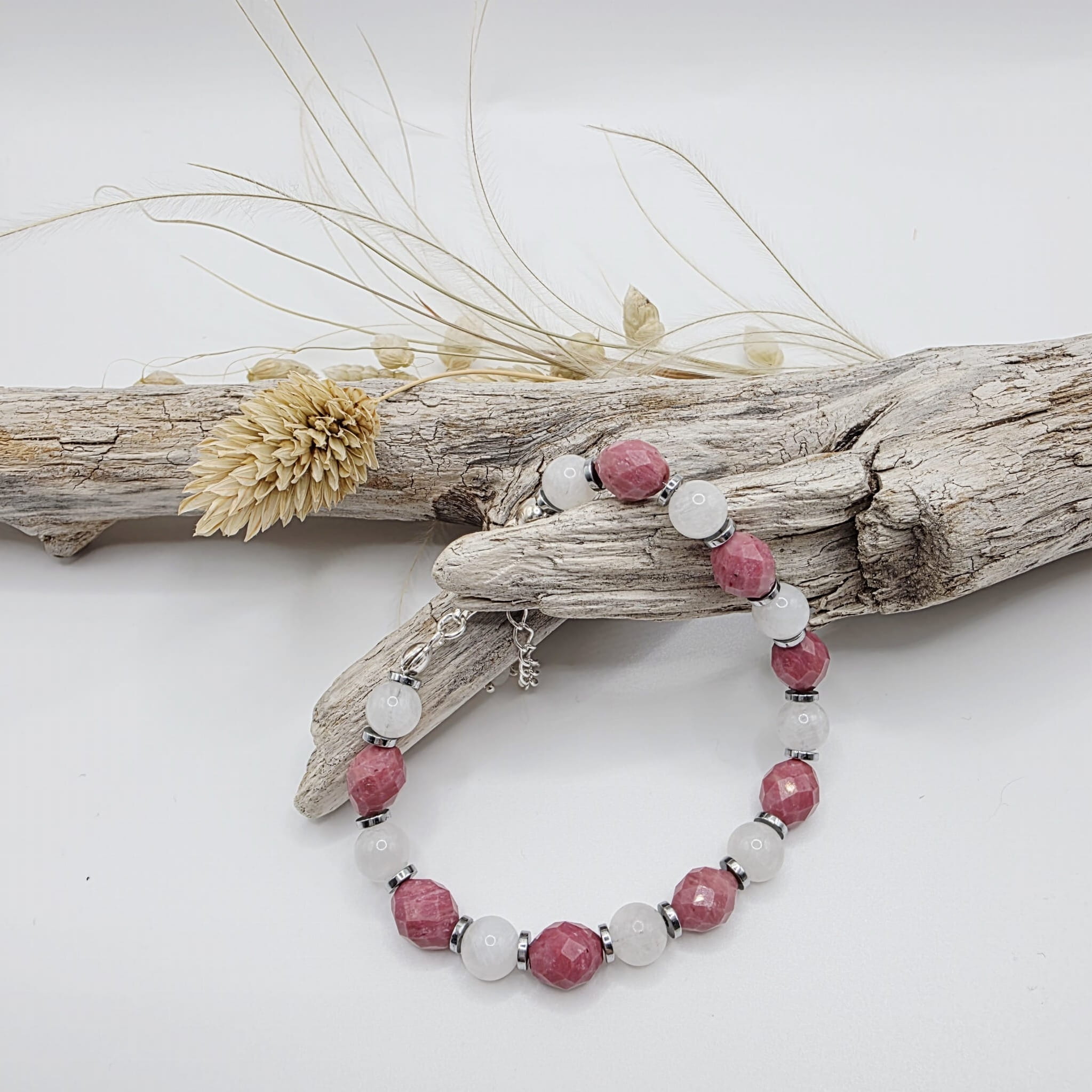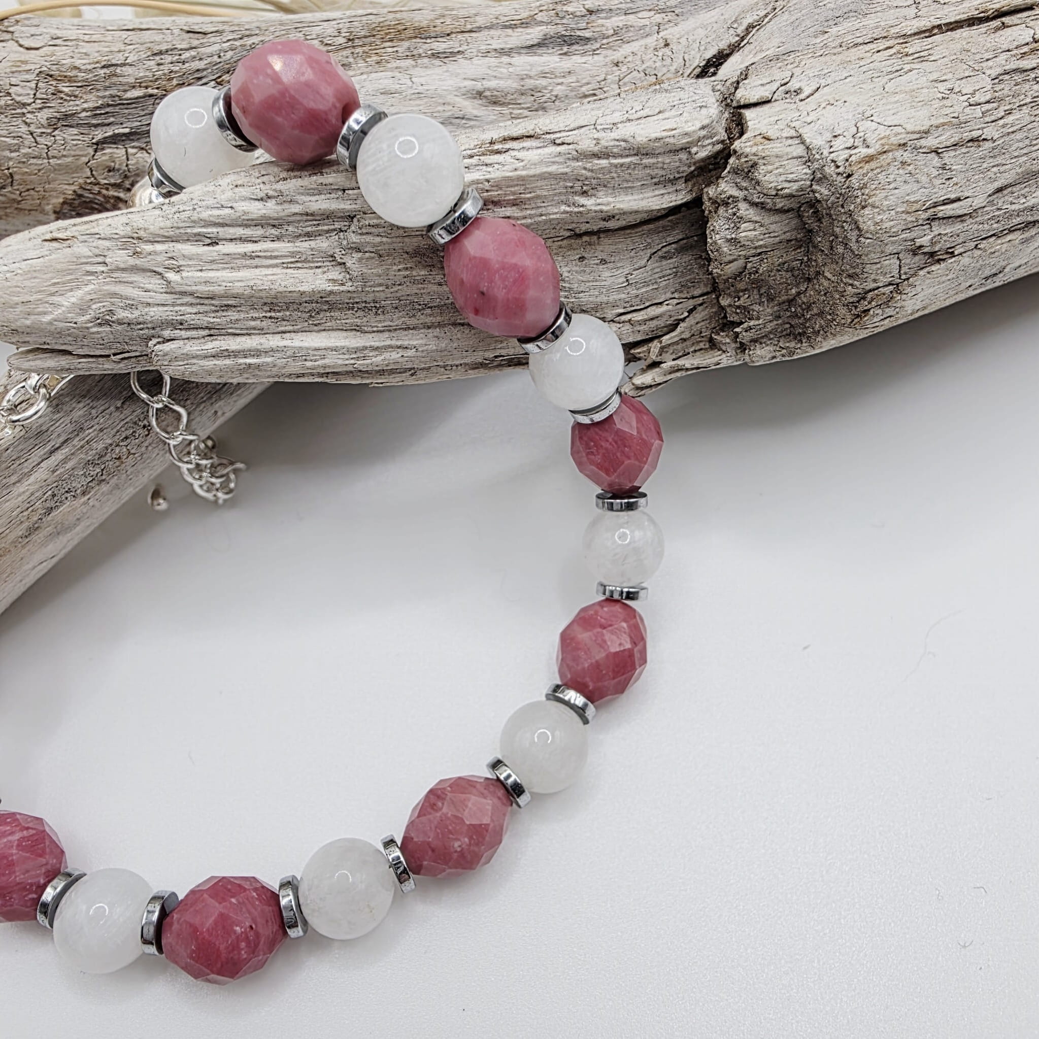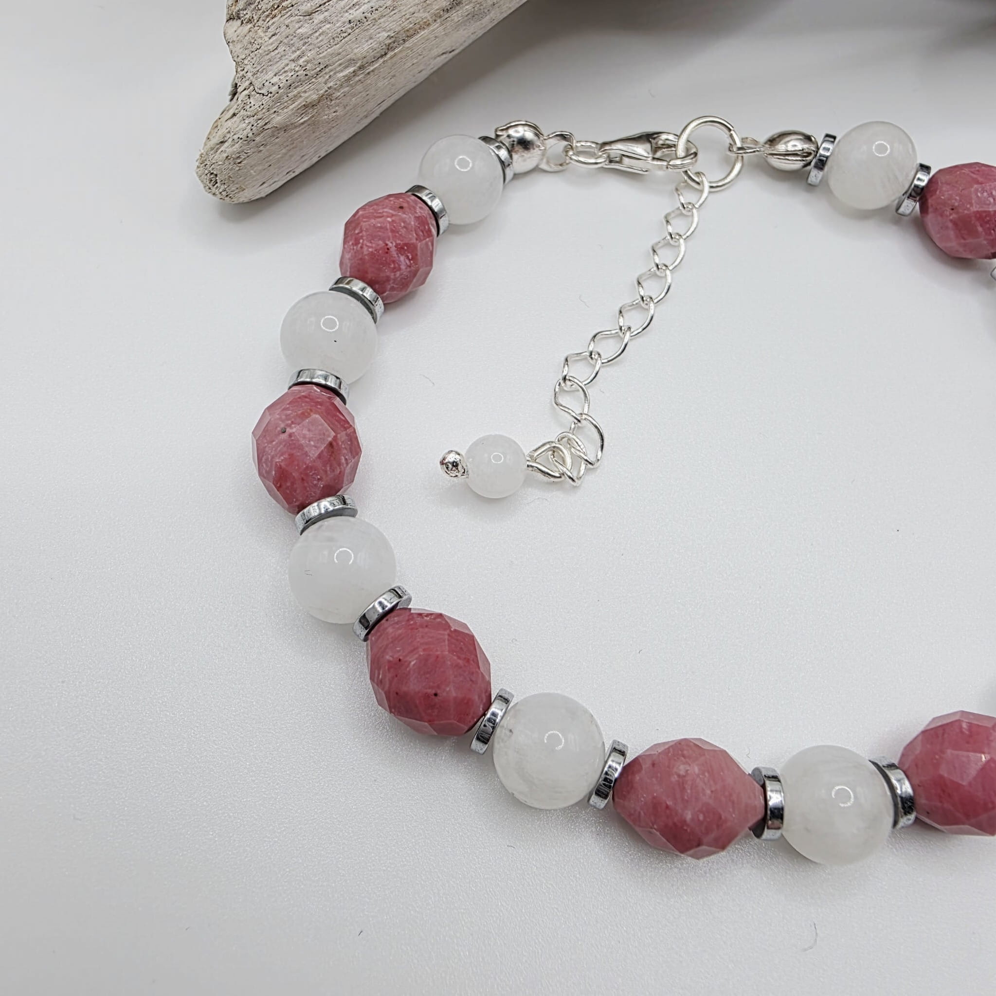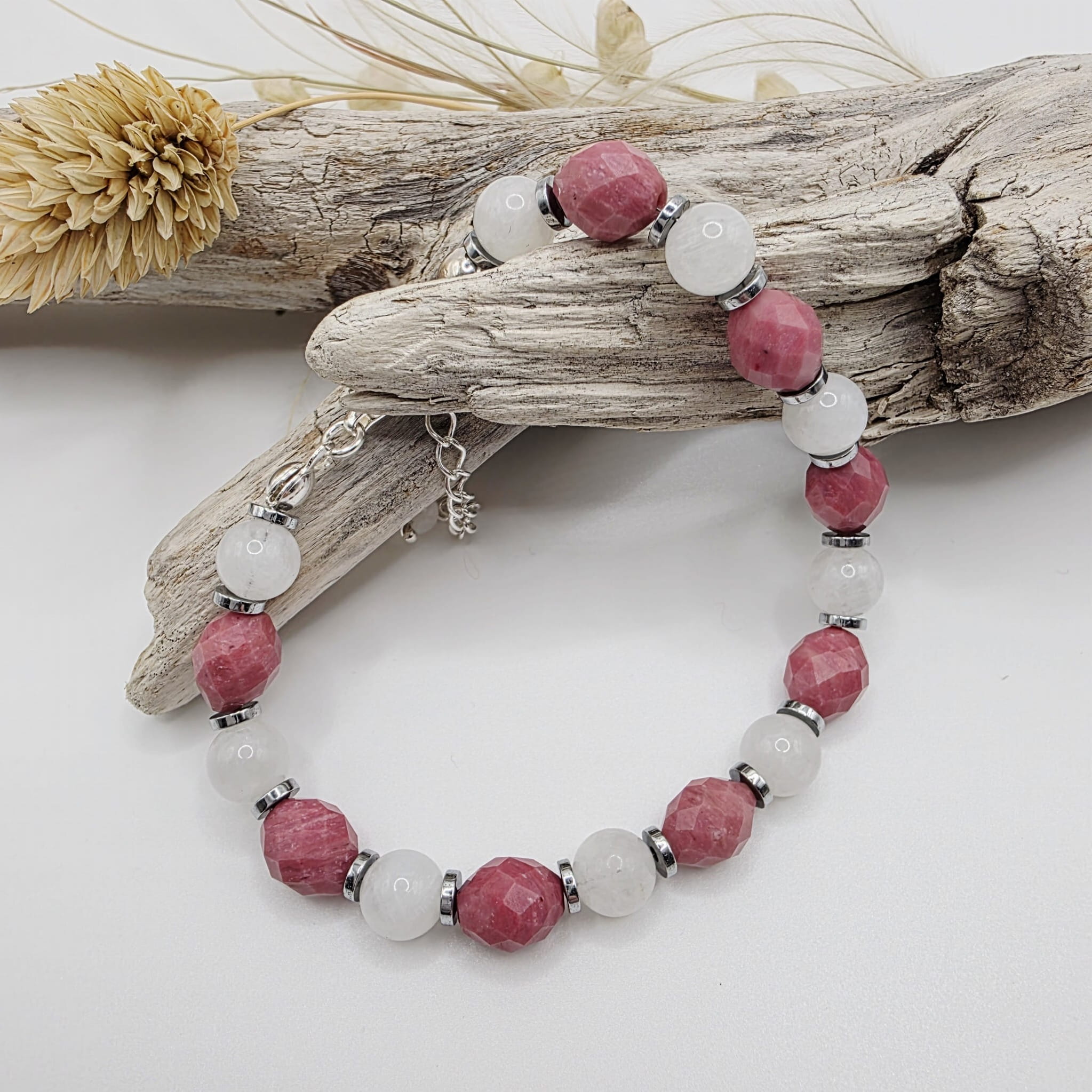 Bransoletka z rodonitem - pięknym różowym kamieniem o niezwykłych właściwościach uzupełnionych mocą kamienia księżycowego i hematytu: