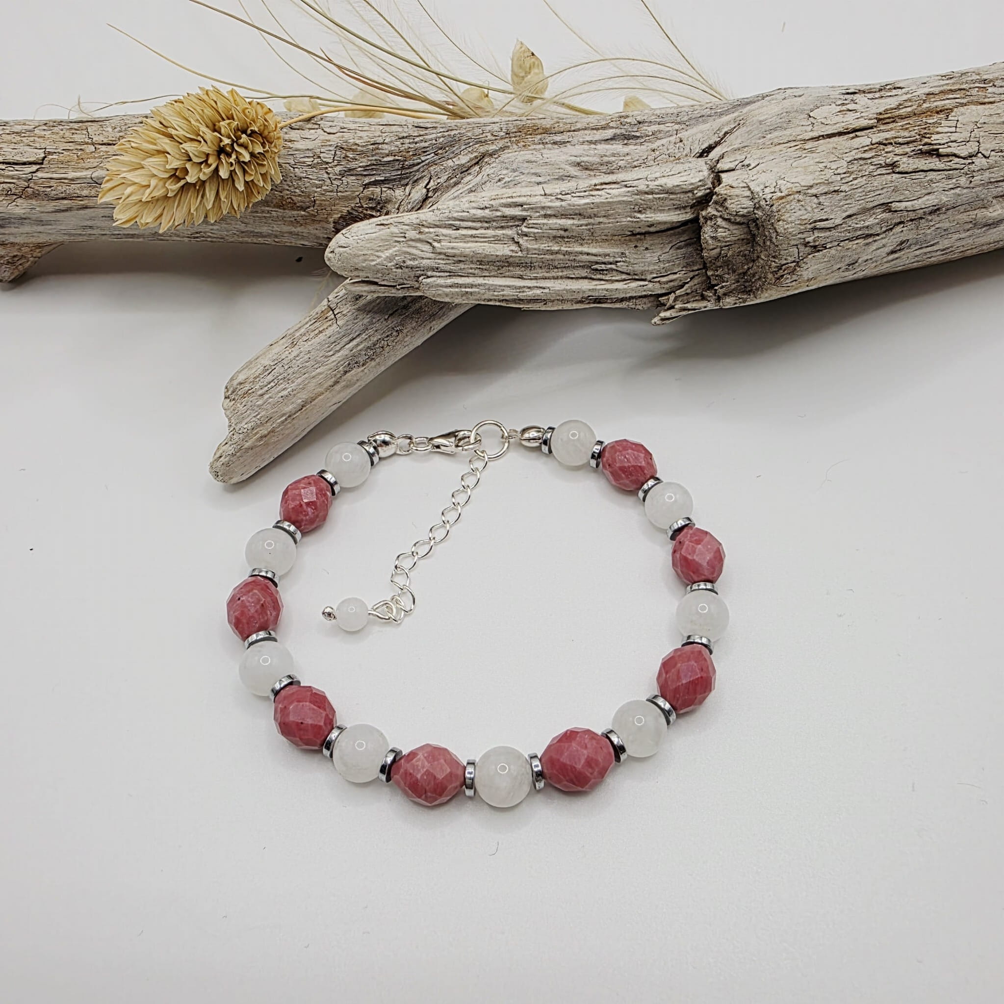 Bransoletka damska z kamieni naturalnych - rodonit i kamień księżycowy