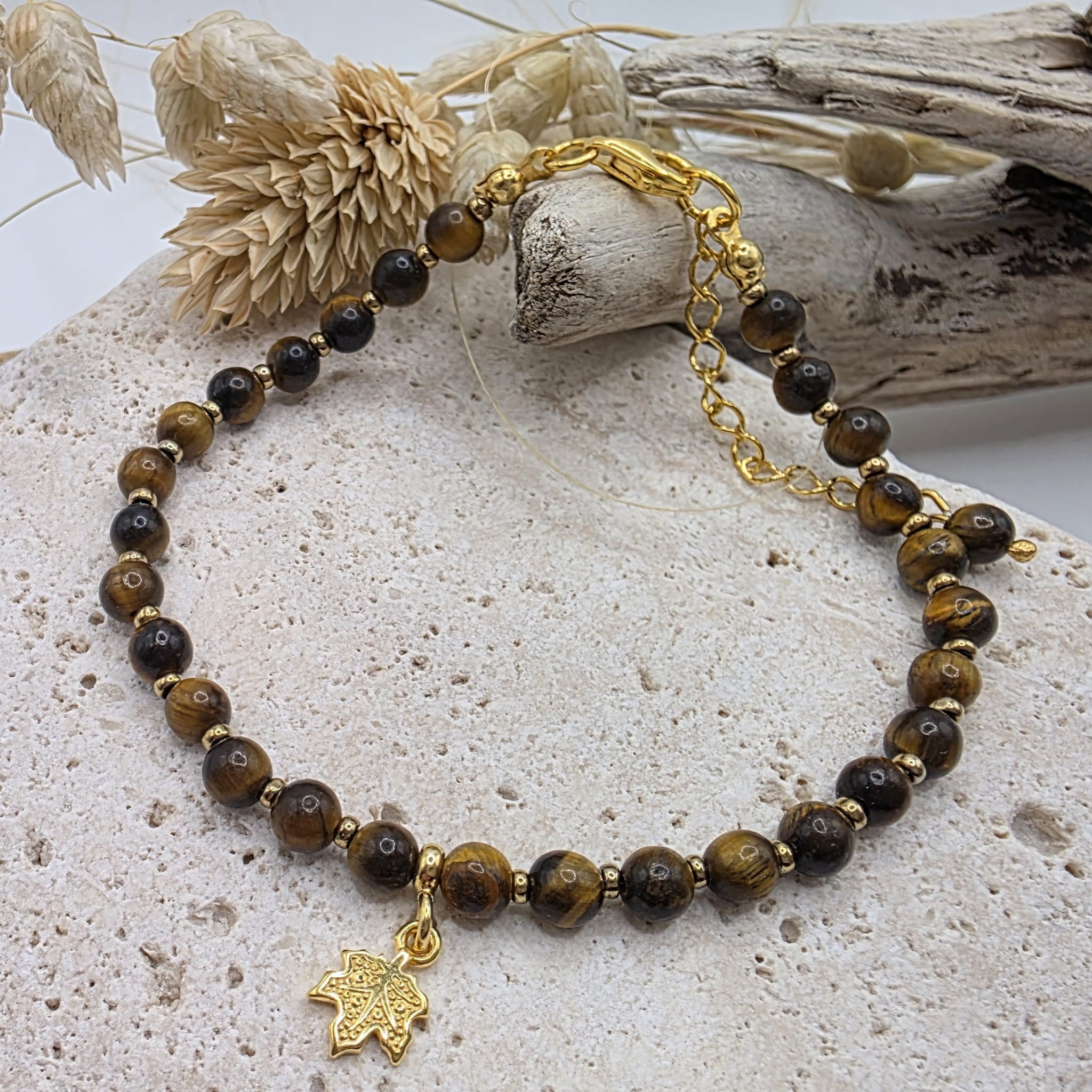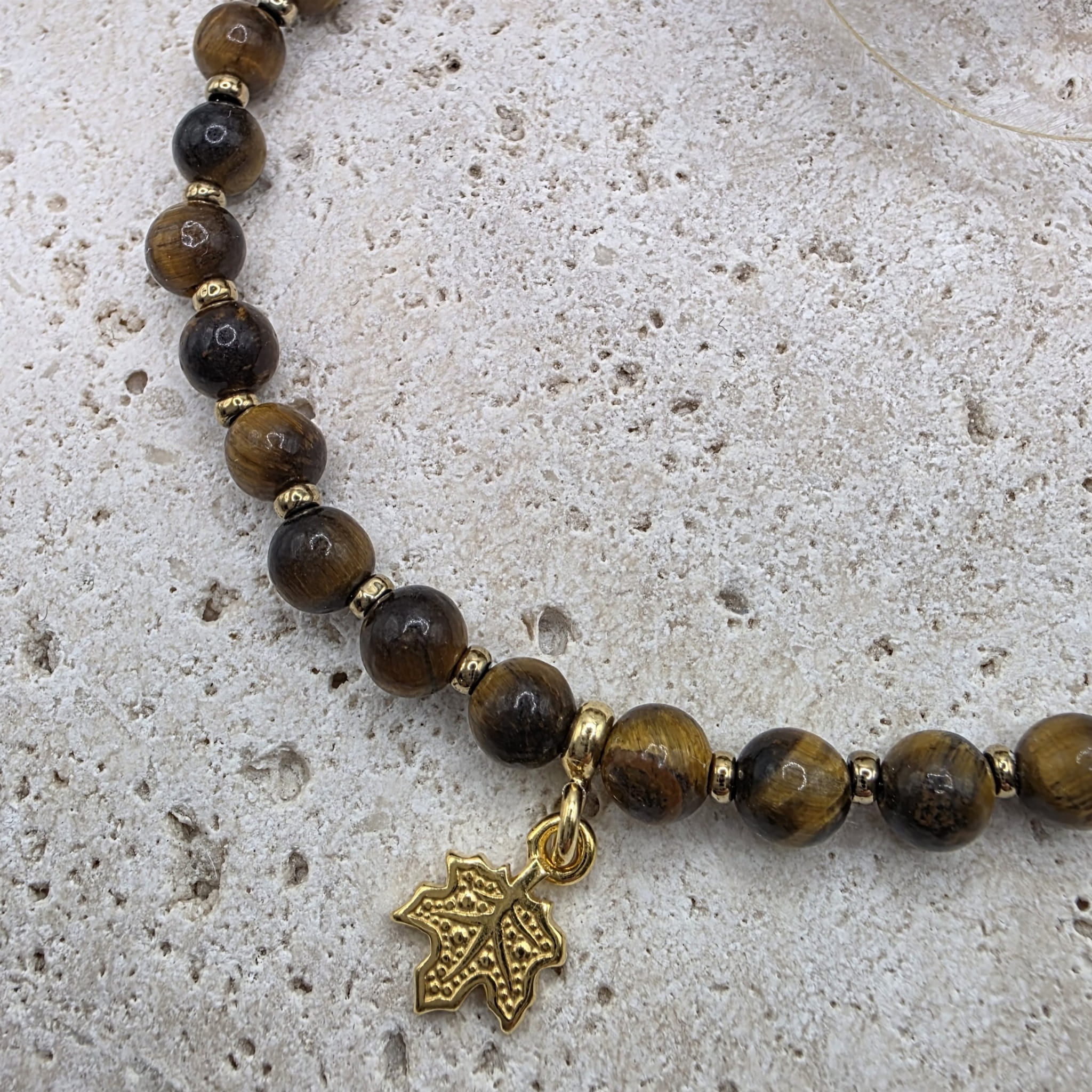 Delikatna i subtelna bransoletka z tygrysiego oka przeplatanego złotym hematytem z zawieszką z uroczym jesiennym listkiem - złota polska jesień :-)