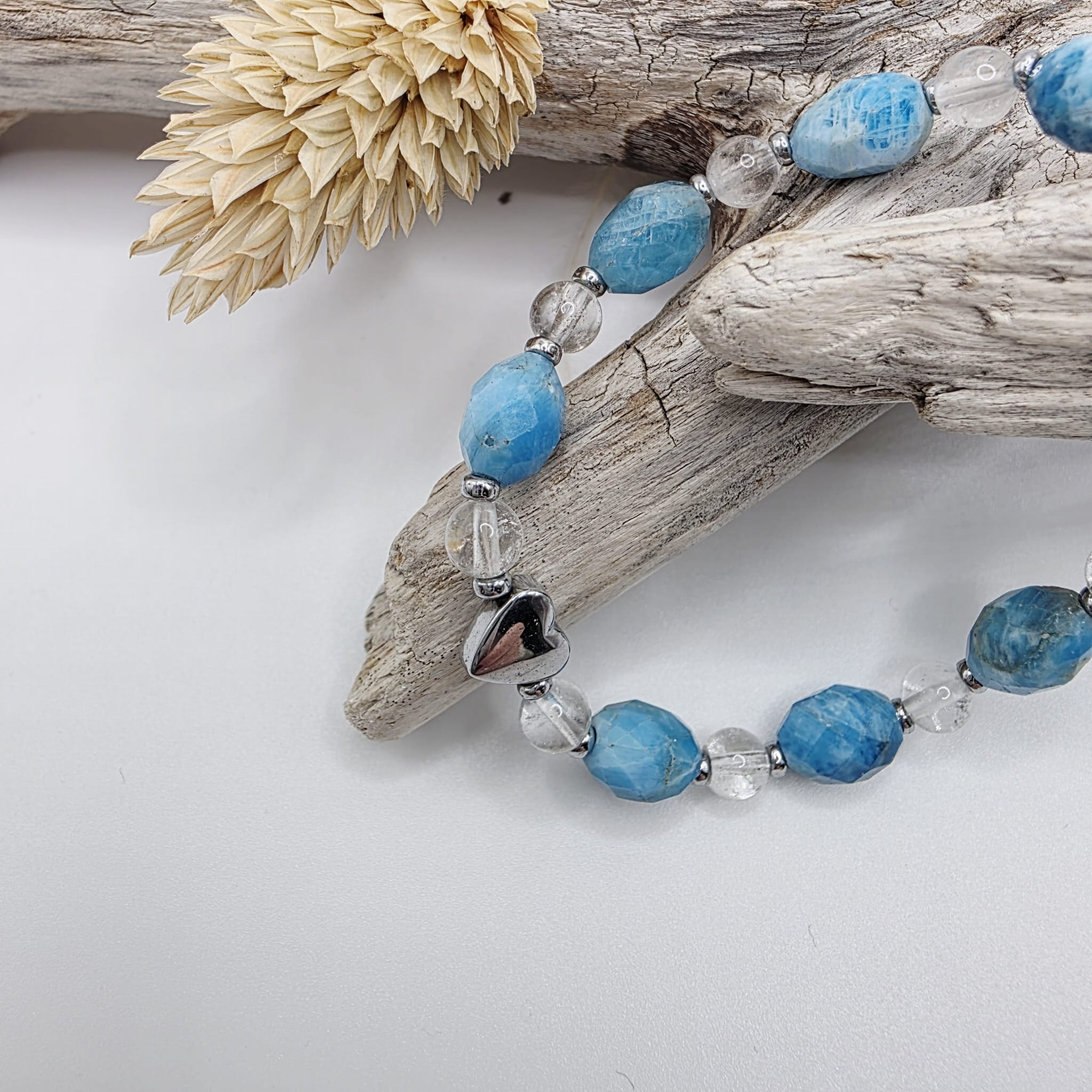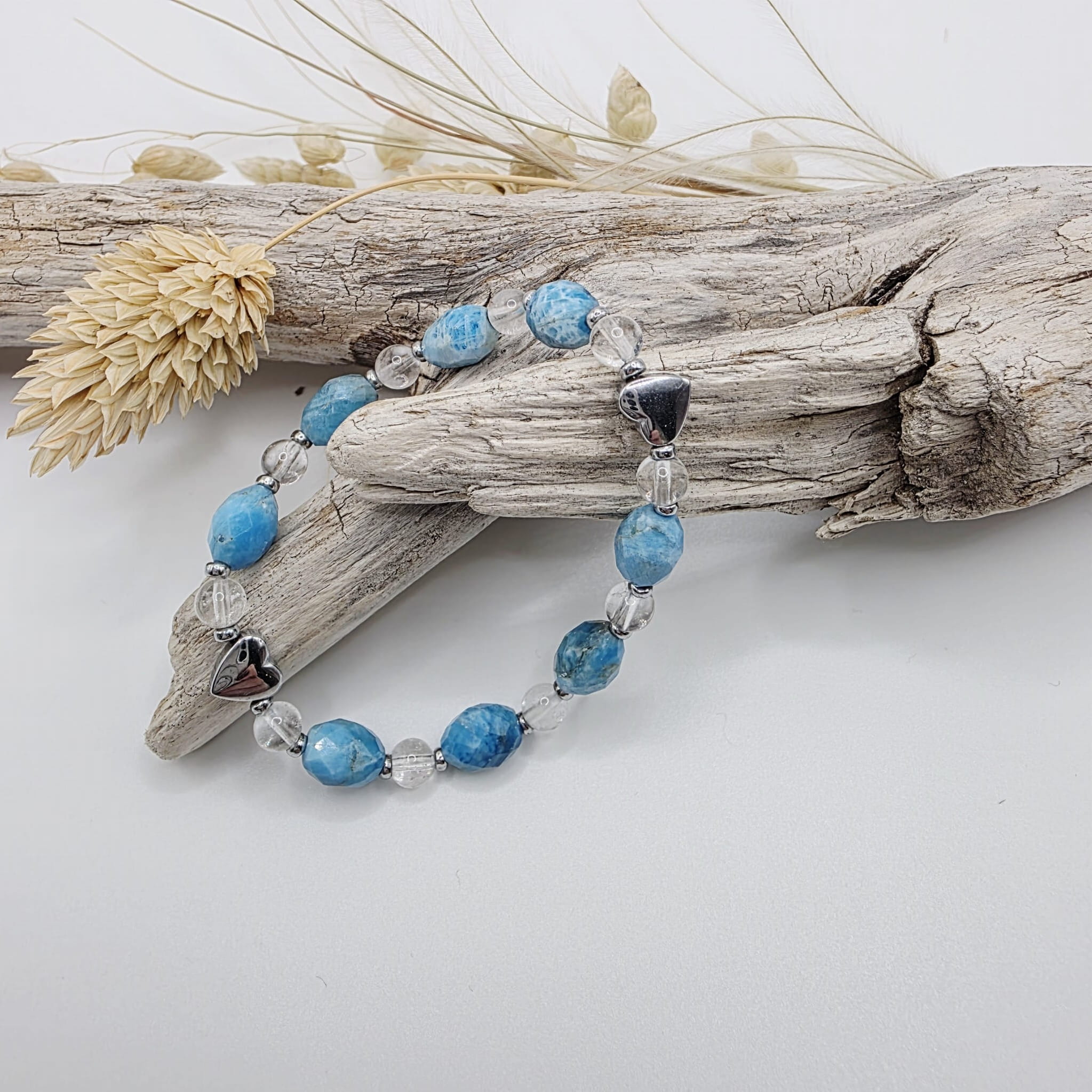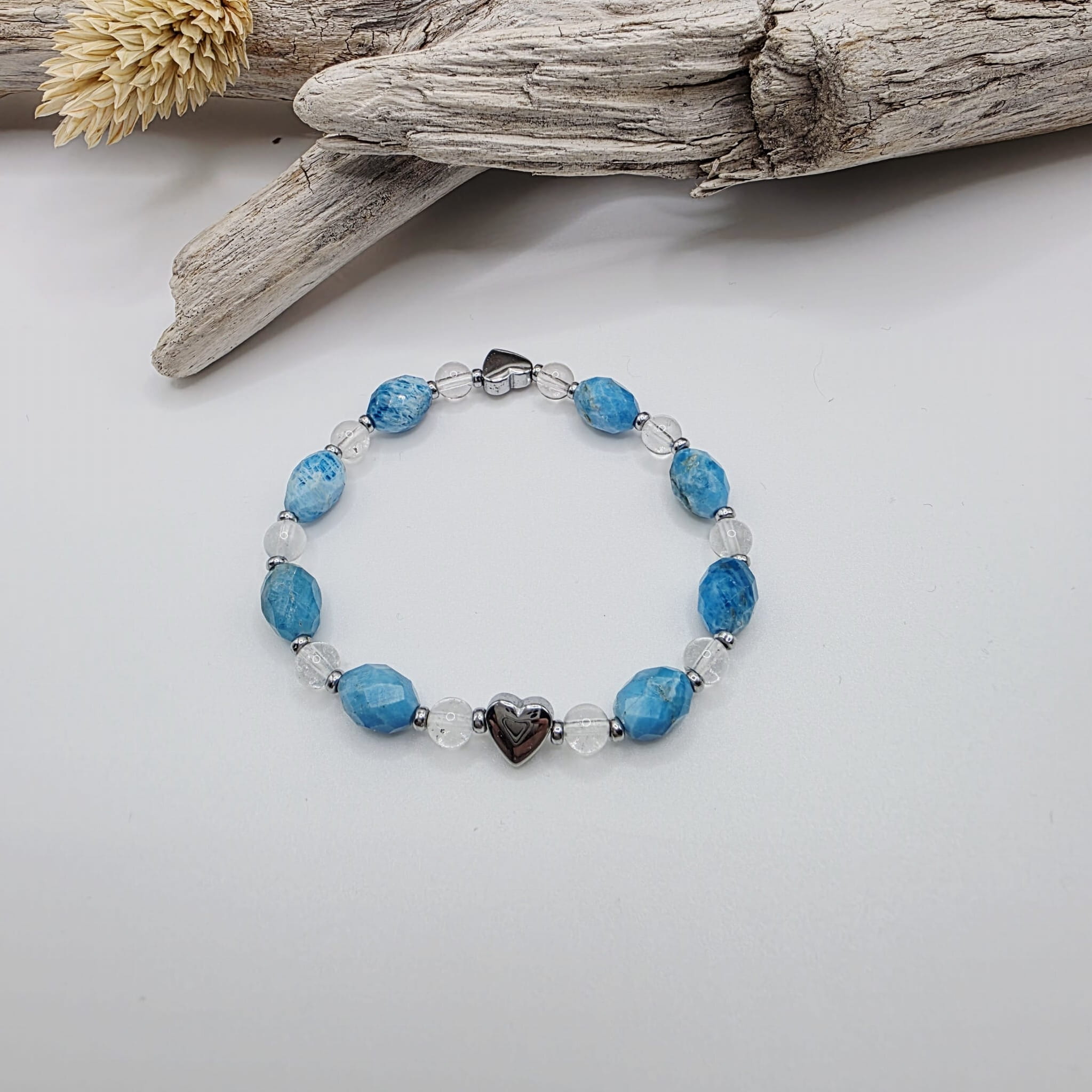 Urocza i delikatna bransoletka z kamieni naturalnych dla dziewczynki - piękny niebieski apatyt, kryształ górski o diamentowym połysku i srebrny hematyt, także w formie serduszek, na pewno wzbudzą zachwyt :-) A do tego magiczna moc kamieni, z których wykonana jest bransoletka z pewnością przyda się każdej małej damie: