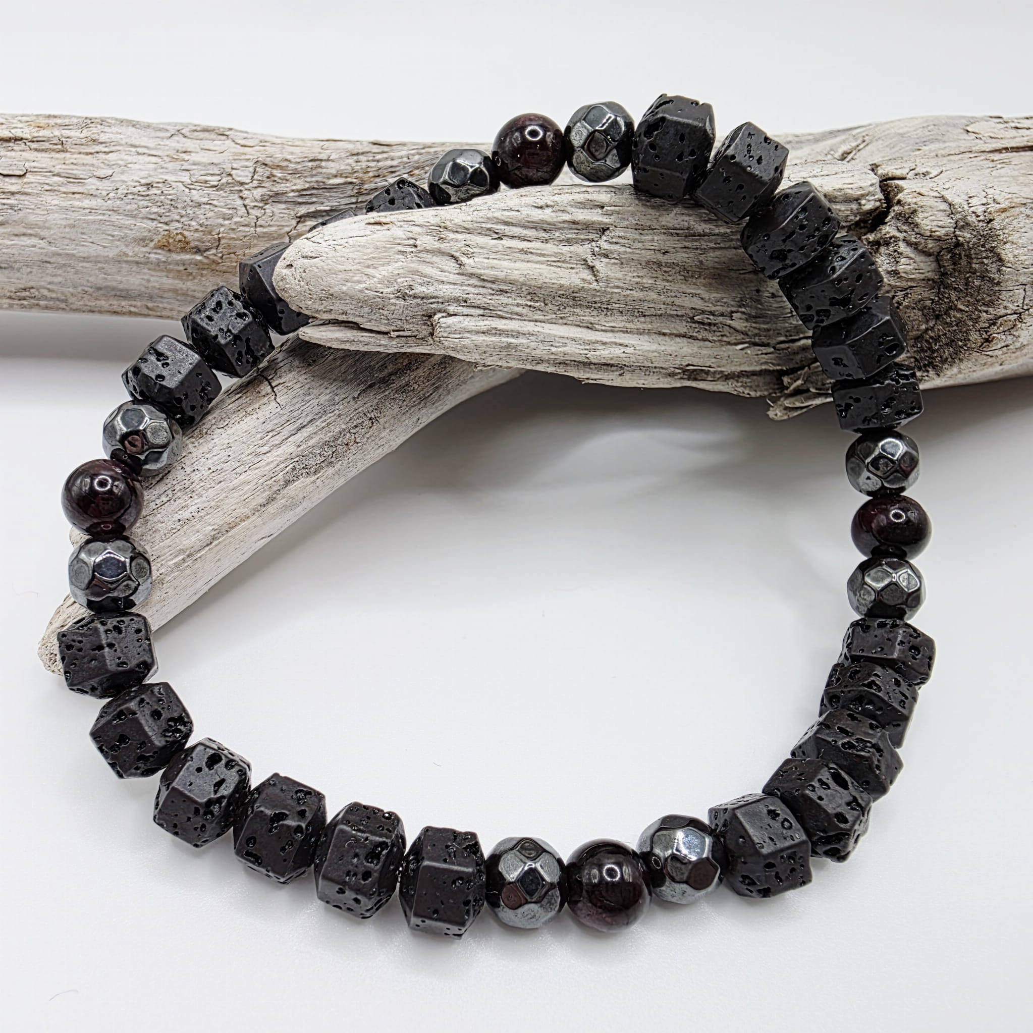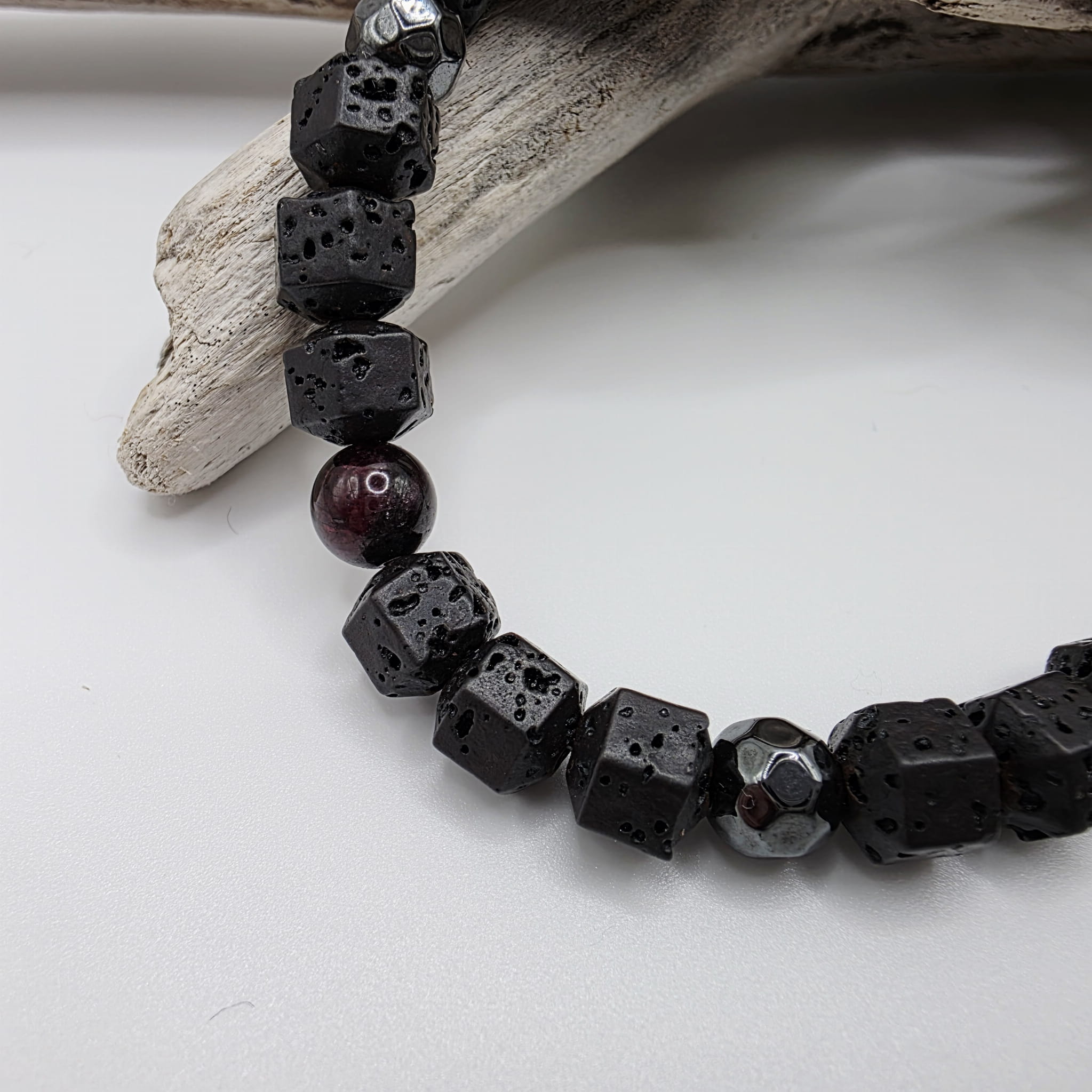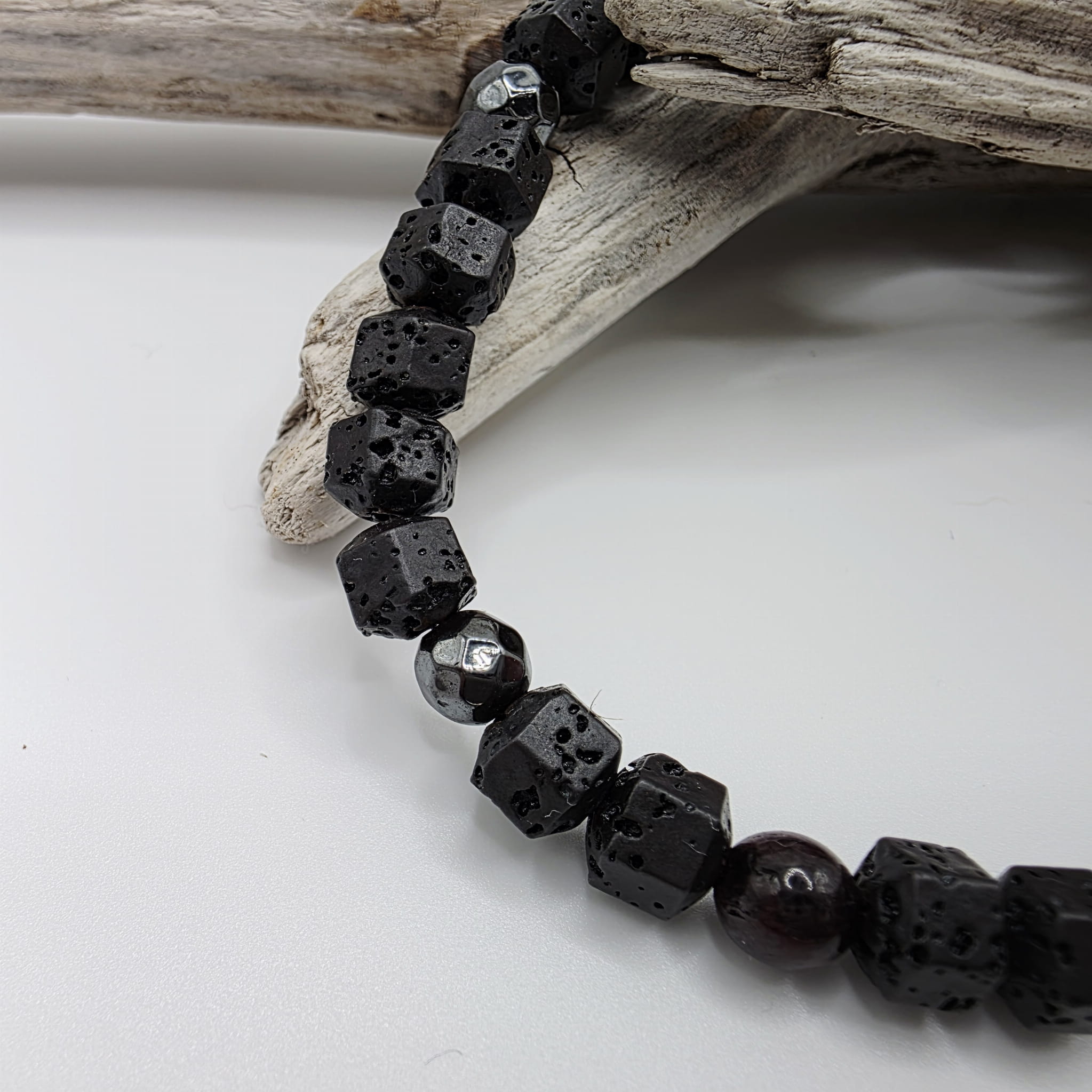 Bransoletka męska z lawy wulkanicznej, granatu i hematytu to matowa struktura czarnych bryłek lawy przeplatanych granatem o głębokim bordowym odcieniu i hematytem w naturalnym grafitowym odcieniu: