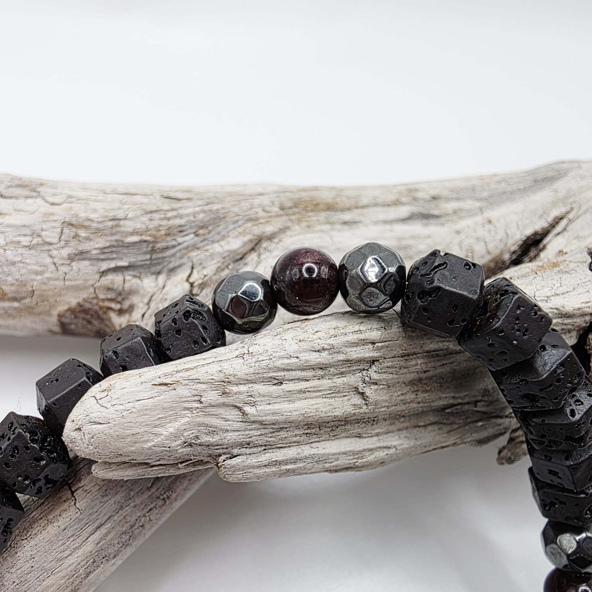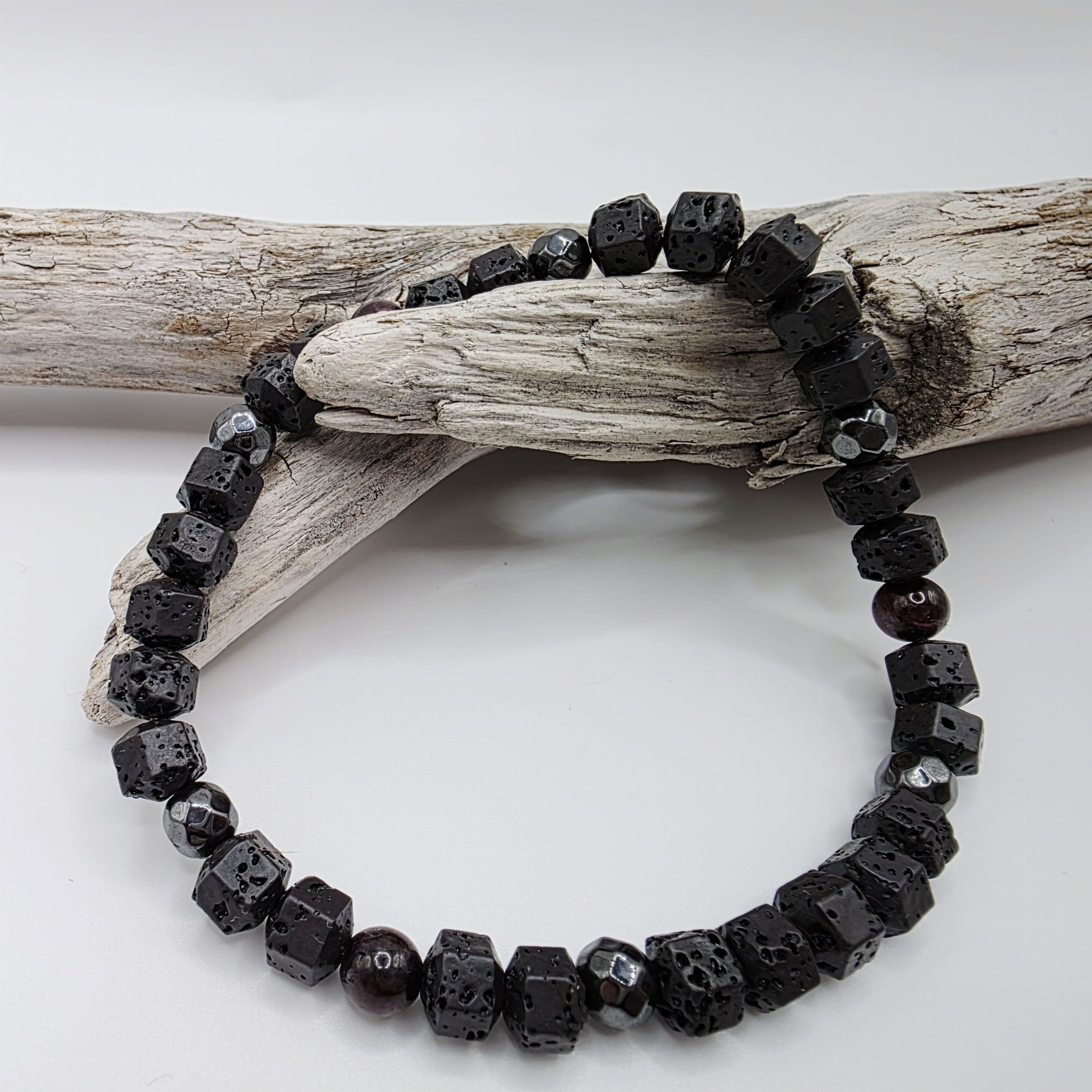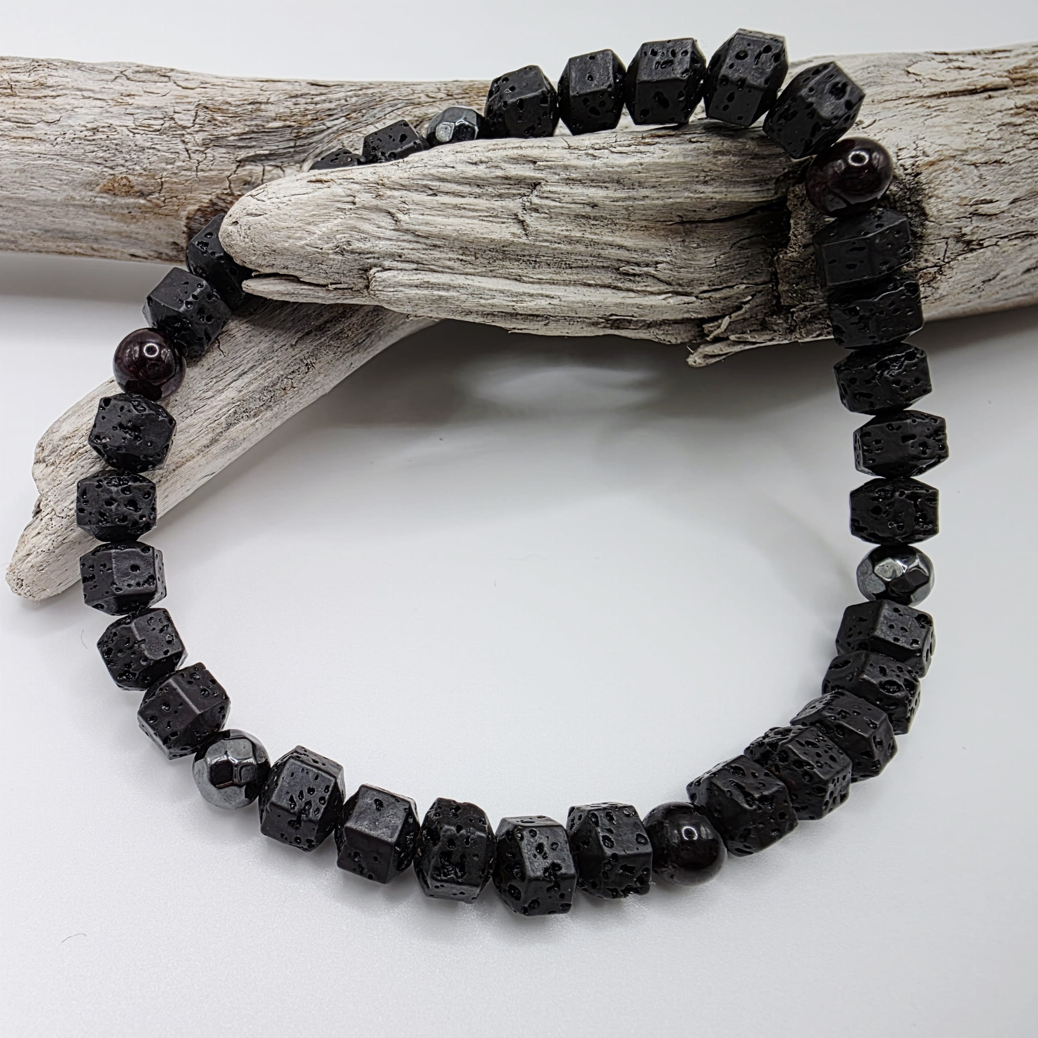 Bransoletka męska z lawy wulkanicznej, granatu i hematytu to matowa struktura czarnych bryłek lawy przeplatanych granatem o głębokim bordowym odcieniu i hematytem w naturalnym grafitowym odcieniu: