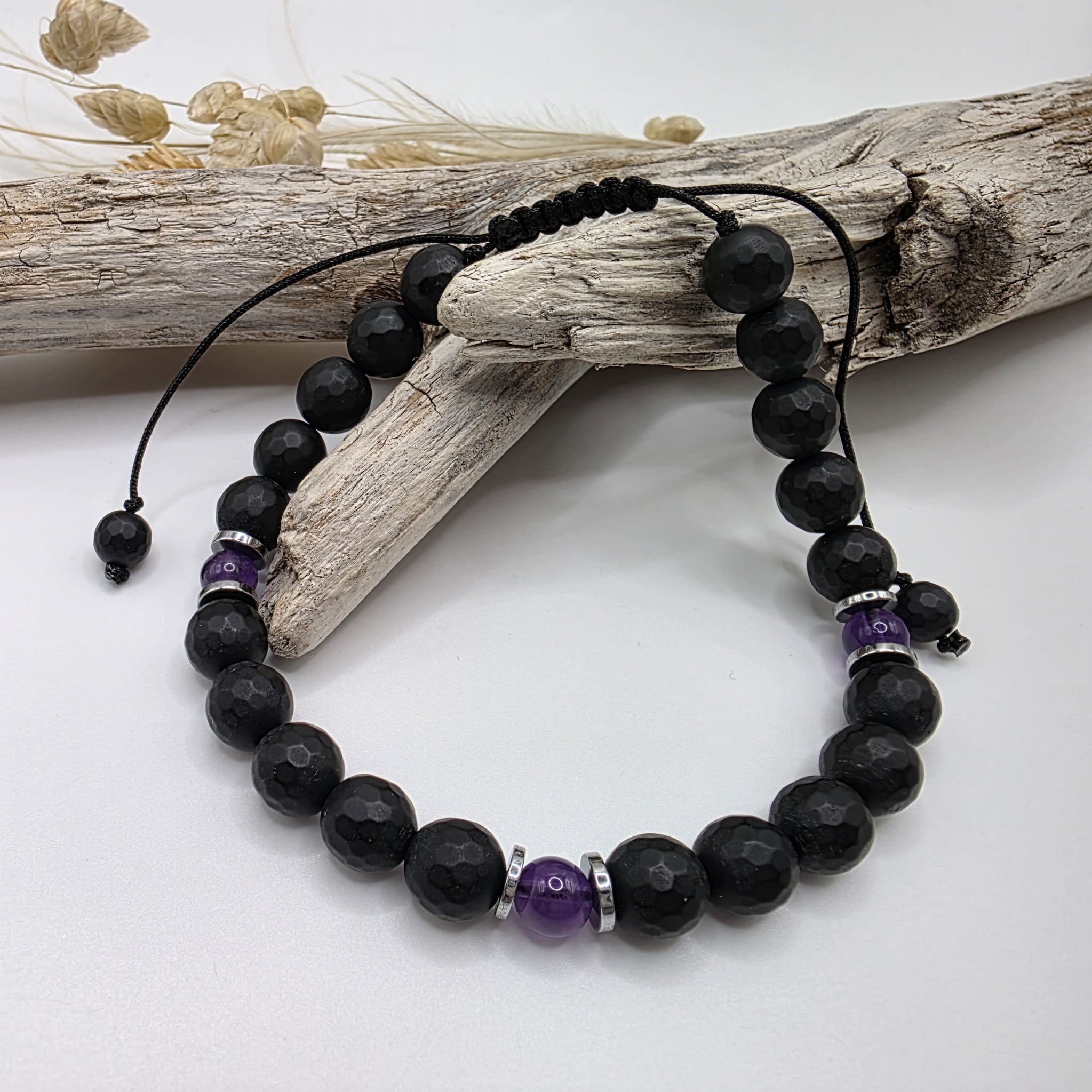 Bransoletka jest wykonana na sznurku - długość regulowana. Będzie pasowała na nadgarstek od 18 cm obwodu. Kulki matowego onyksu mają średnicę 8 mm, ametystu - 6 mm.