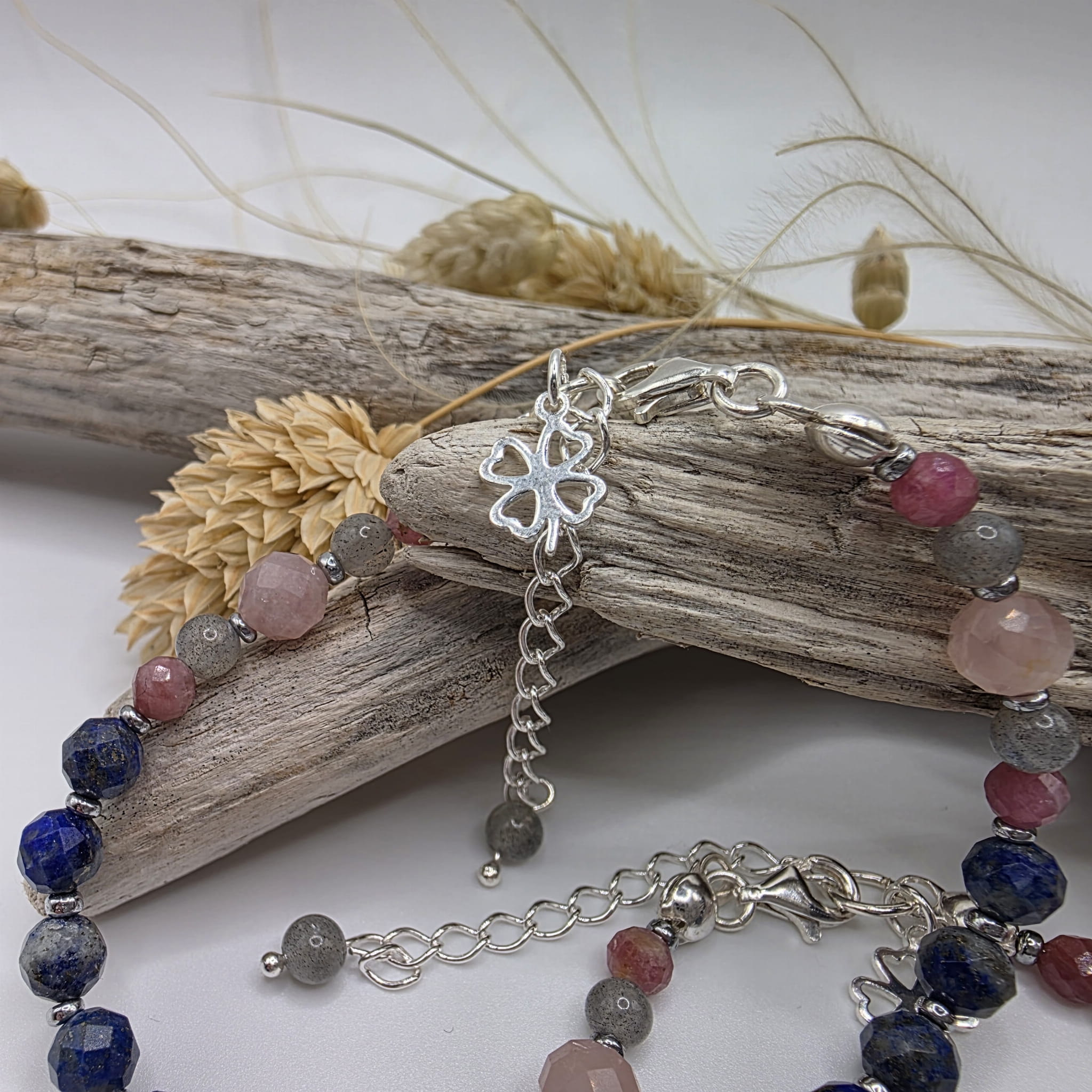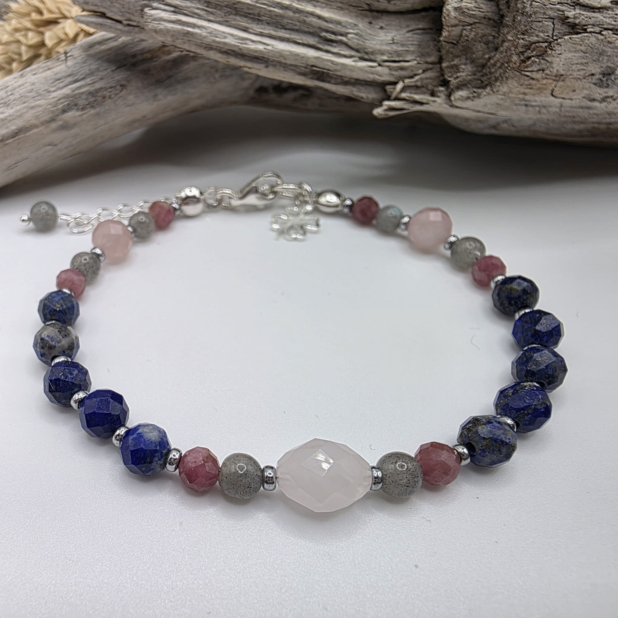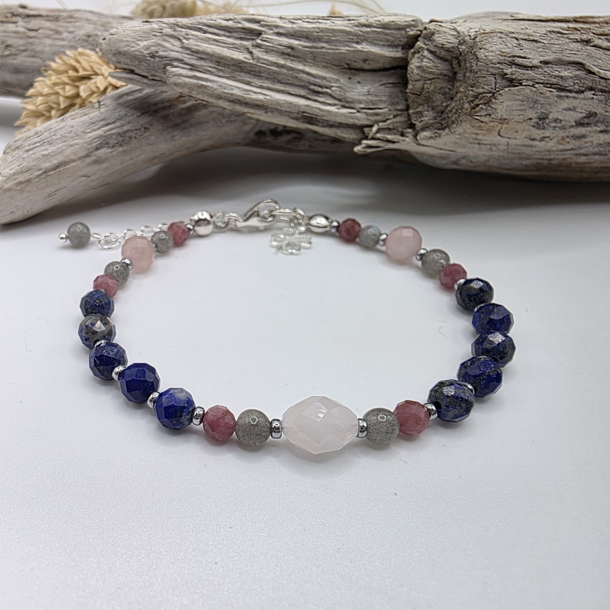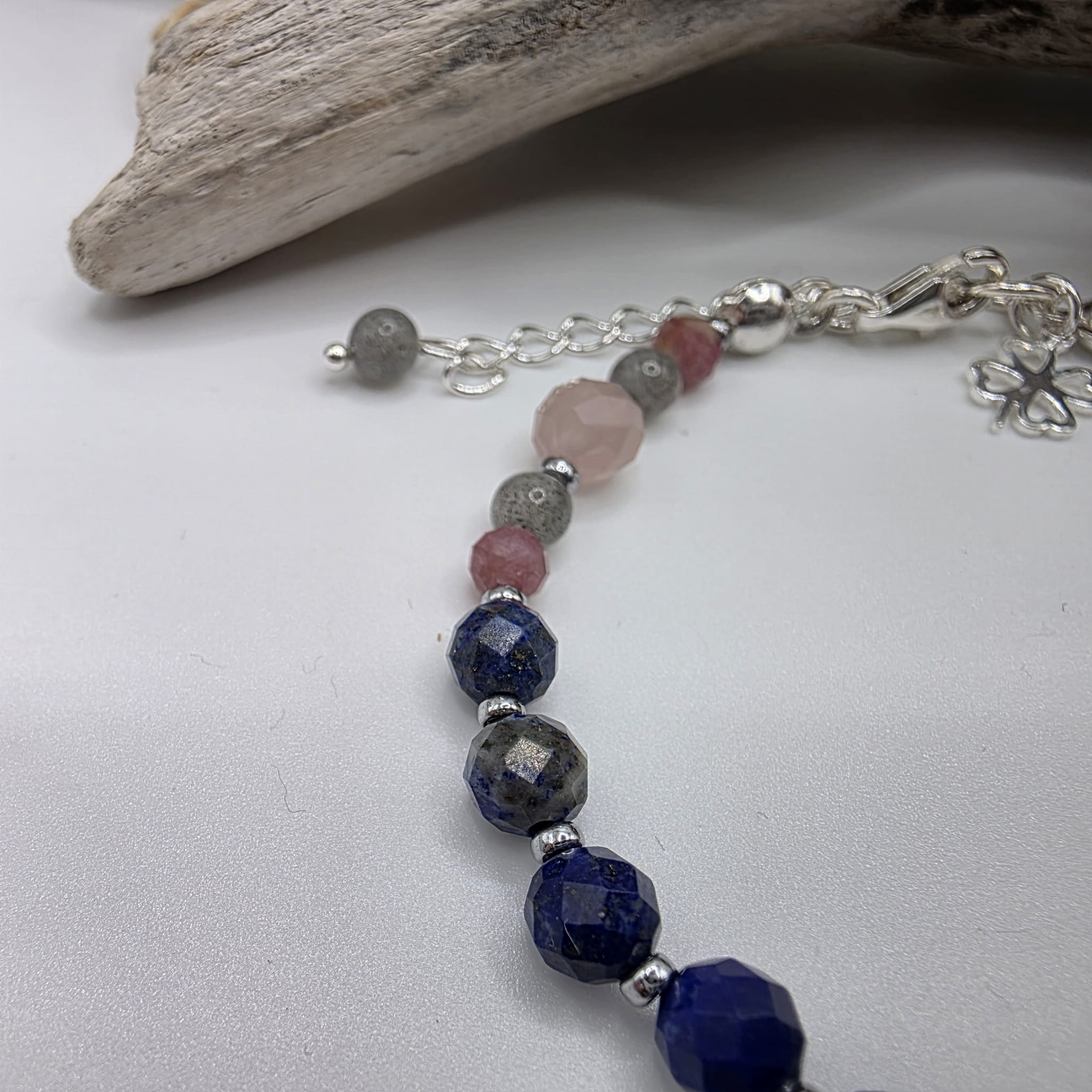 Bransoletka przyjaźni z kamieni naturalnych - lapis lazuli, kwarcu różowego, turmalinu różowego i labradorytu - te minerały wzmacniają więzi międzyludzkie:
