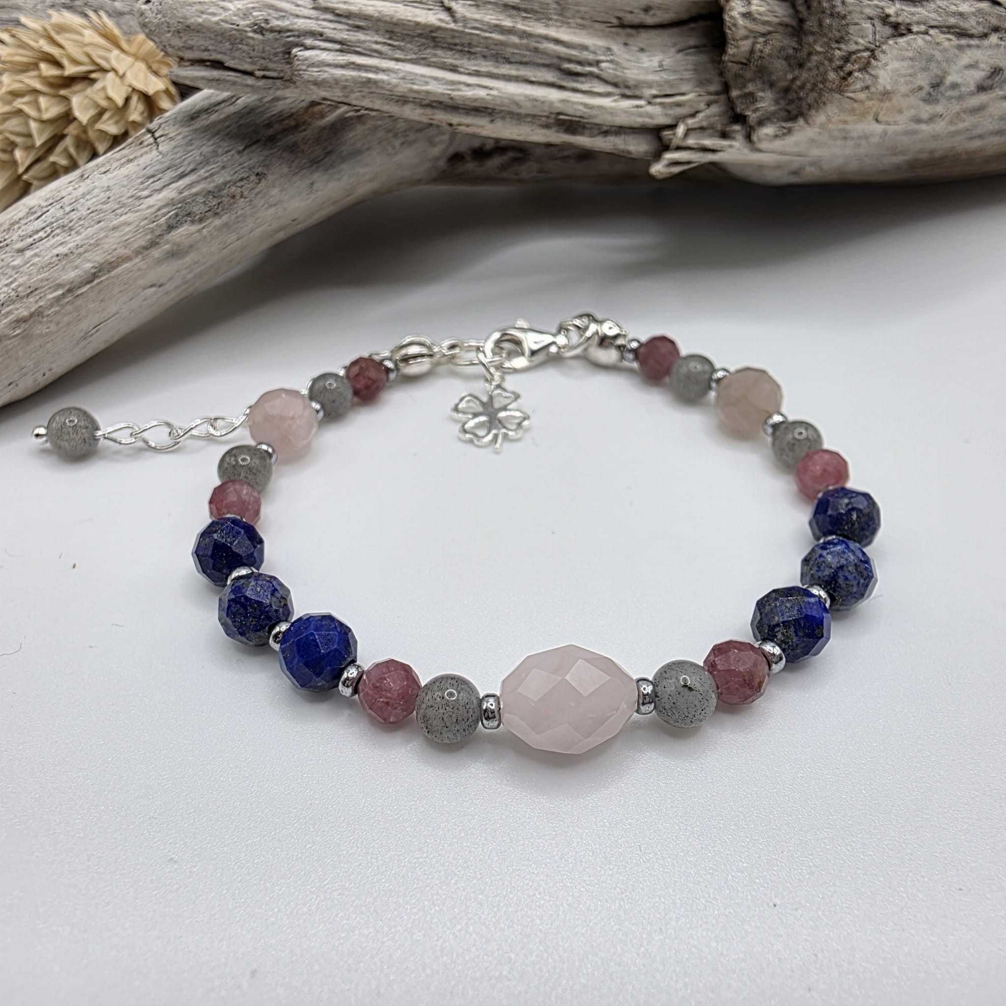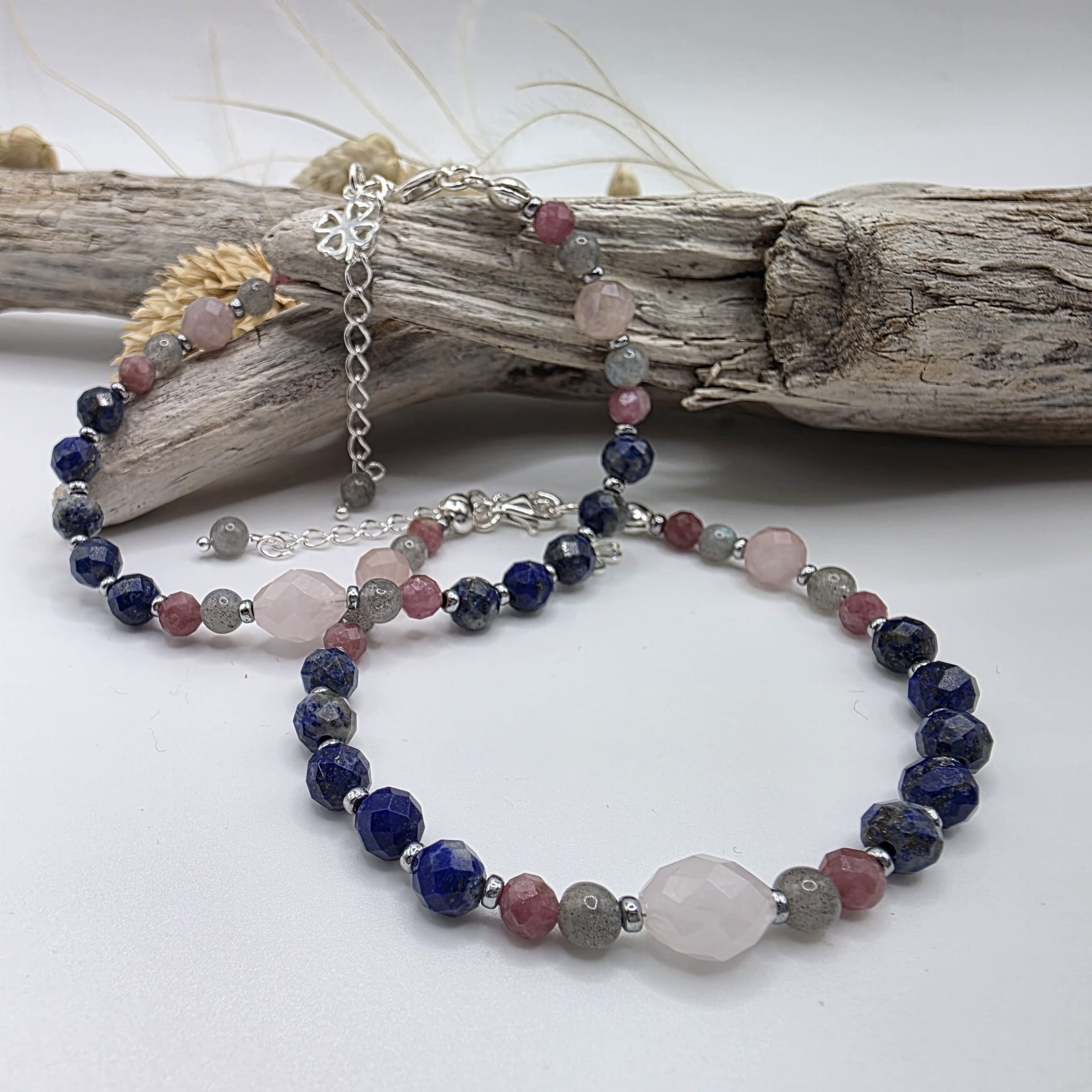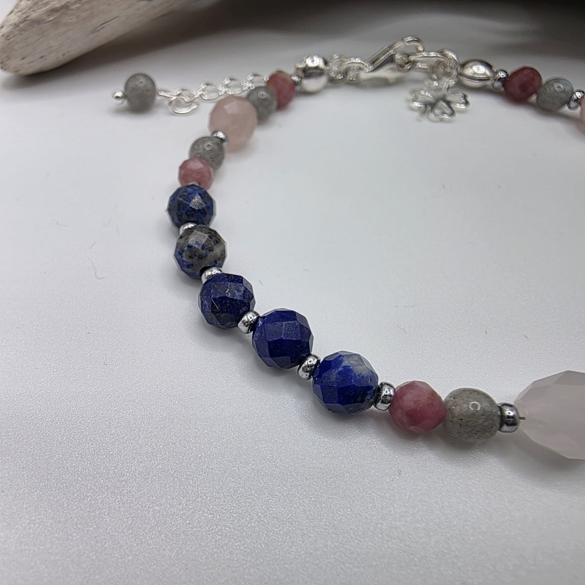 Bransoletka przyjaźni z kamieni naturalnych - lapis lazuli, kwarcu różowego, turmalinu różowego i labradorytu - te minerały wzmacniają więzi międzyludzkie: