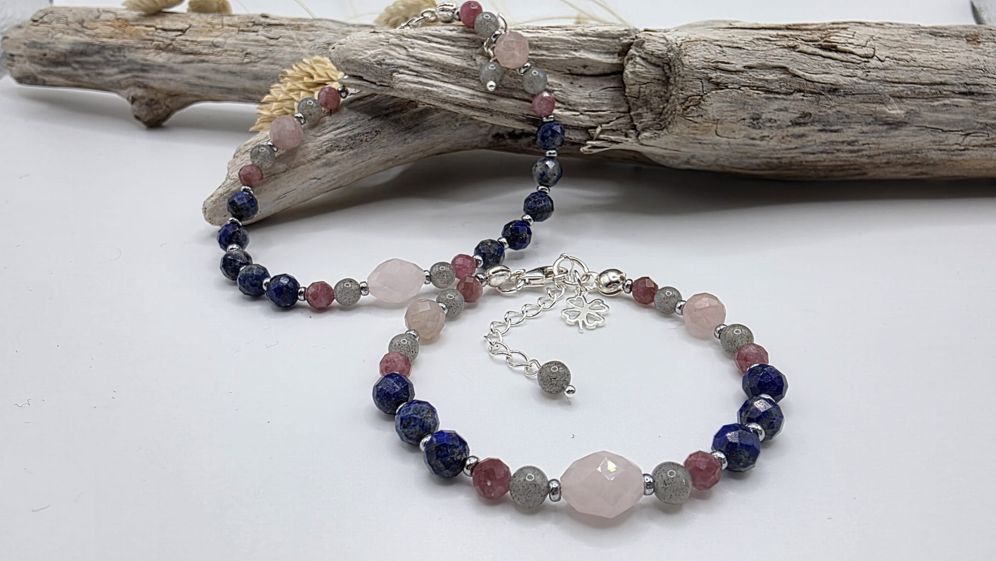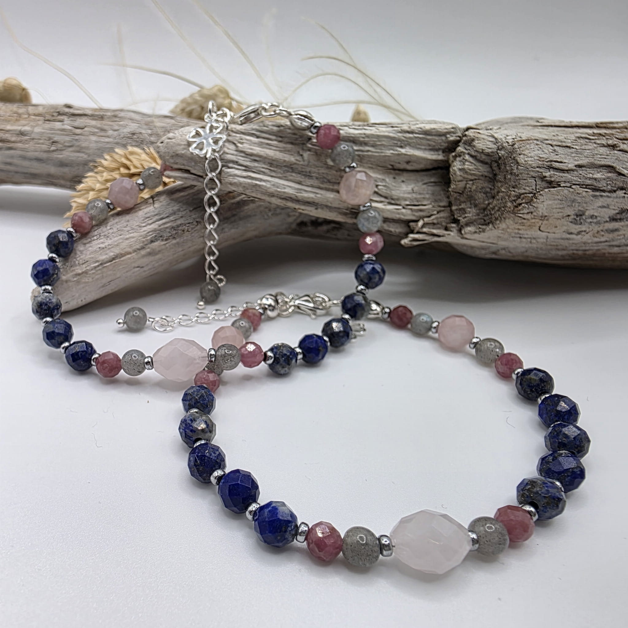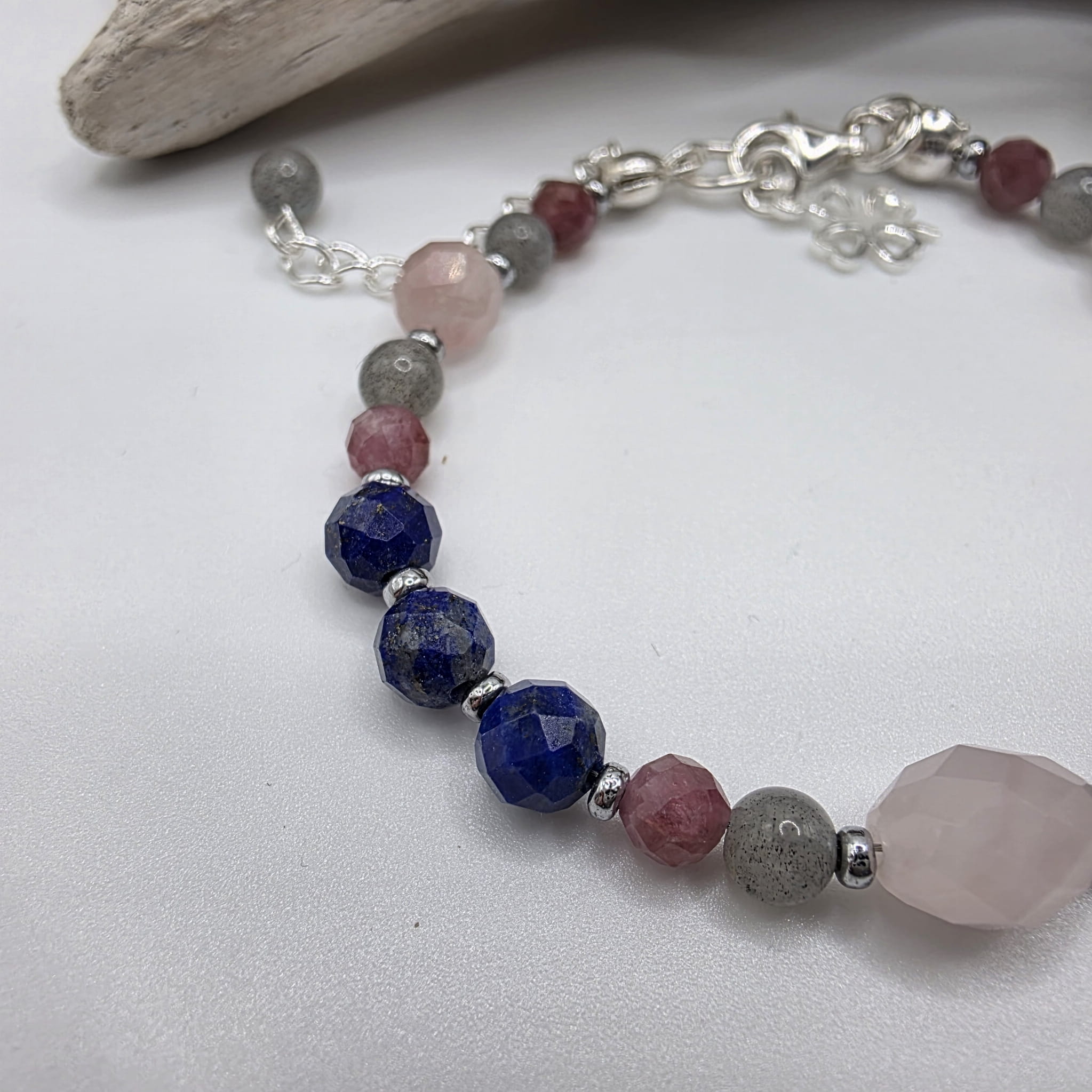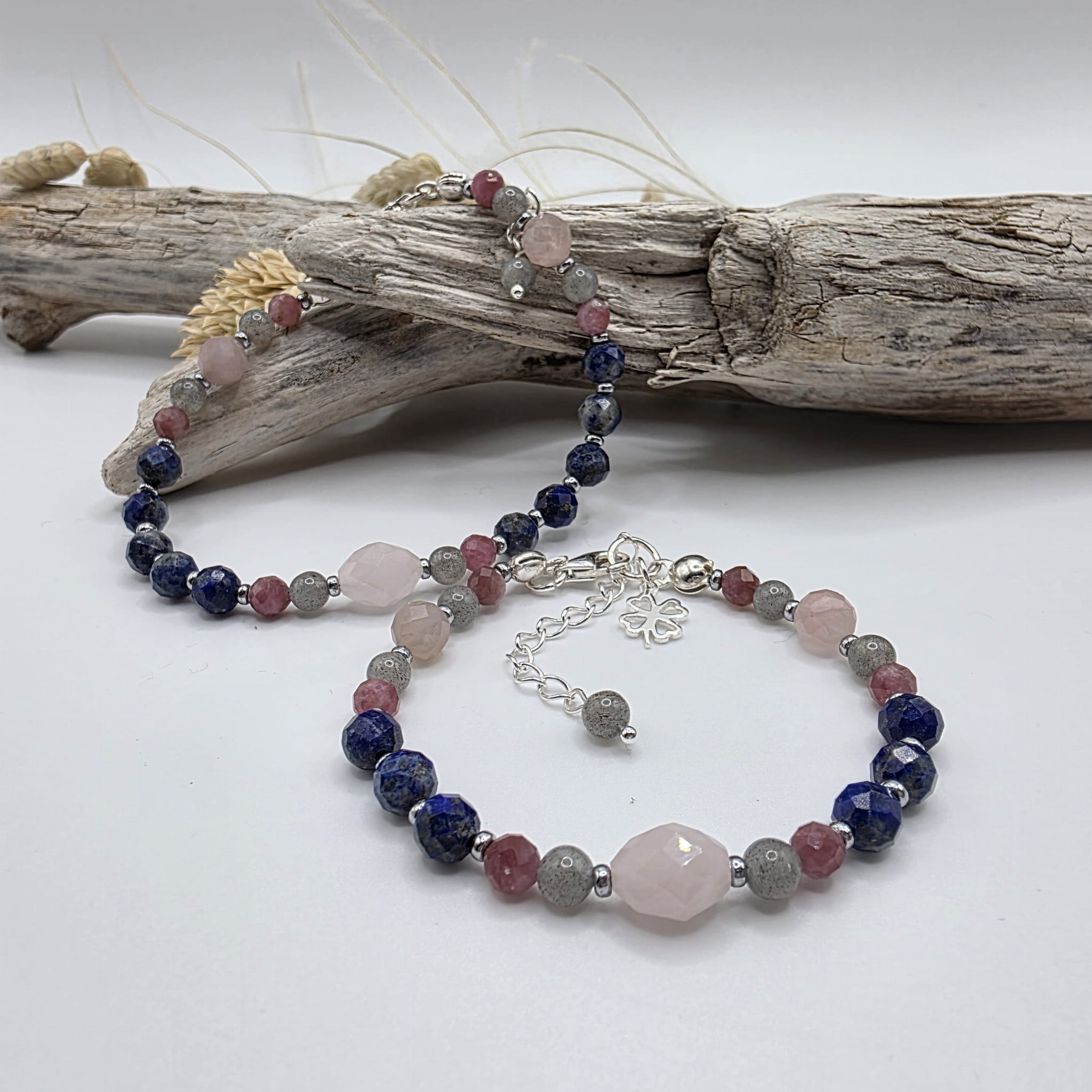 Bransoletka przyjaźni z kamieni naturalnych - lapis lazuli, kwarcu różowego, turmalinu różowego i labradorytu - te minerały wzmacniają więzi międzyludzkie: