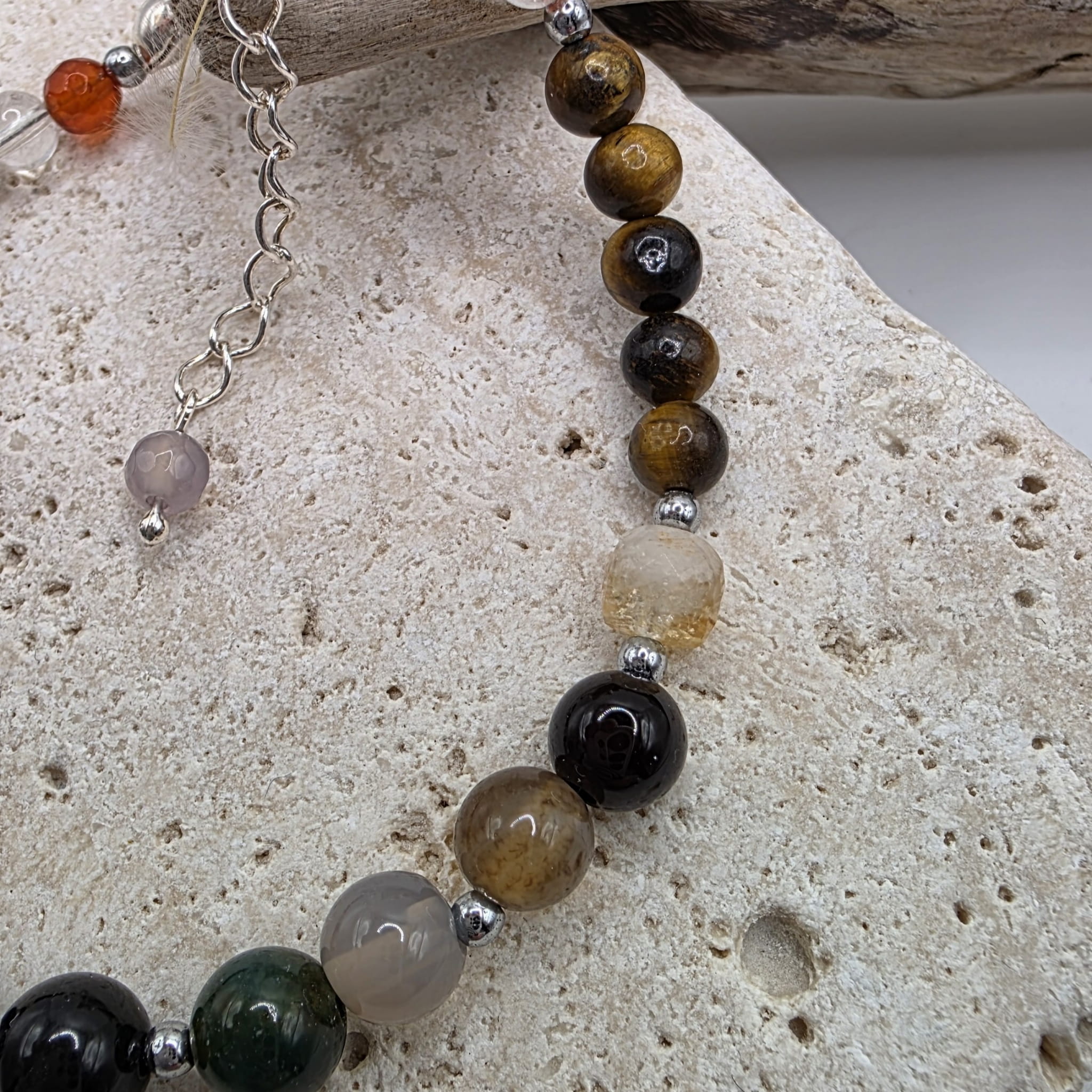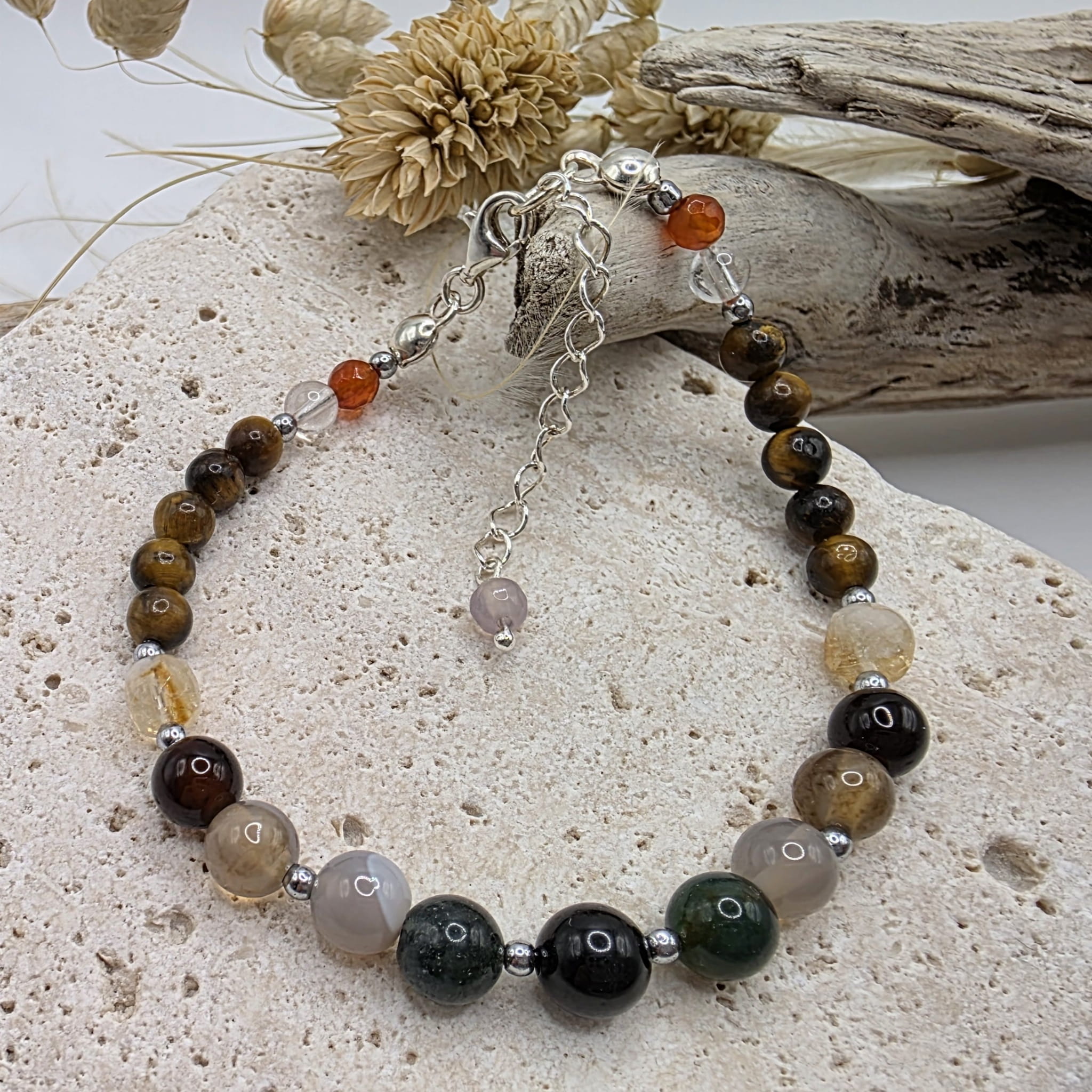 Bransoletkę z kamieni naturalnych dla zodiakalnych Bliźniąt zdominował agat w różnych odcieniach uzupełniony tygrysim okiem, cytrynem i kryształem górskim. Centralnym kamieniem jest jednak czarny turmalin - najsilniejszy kamień ochronny.