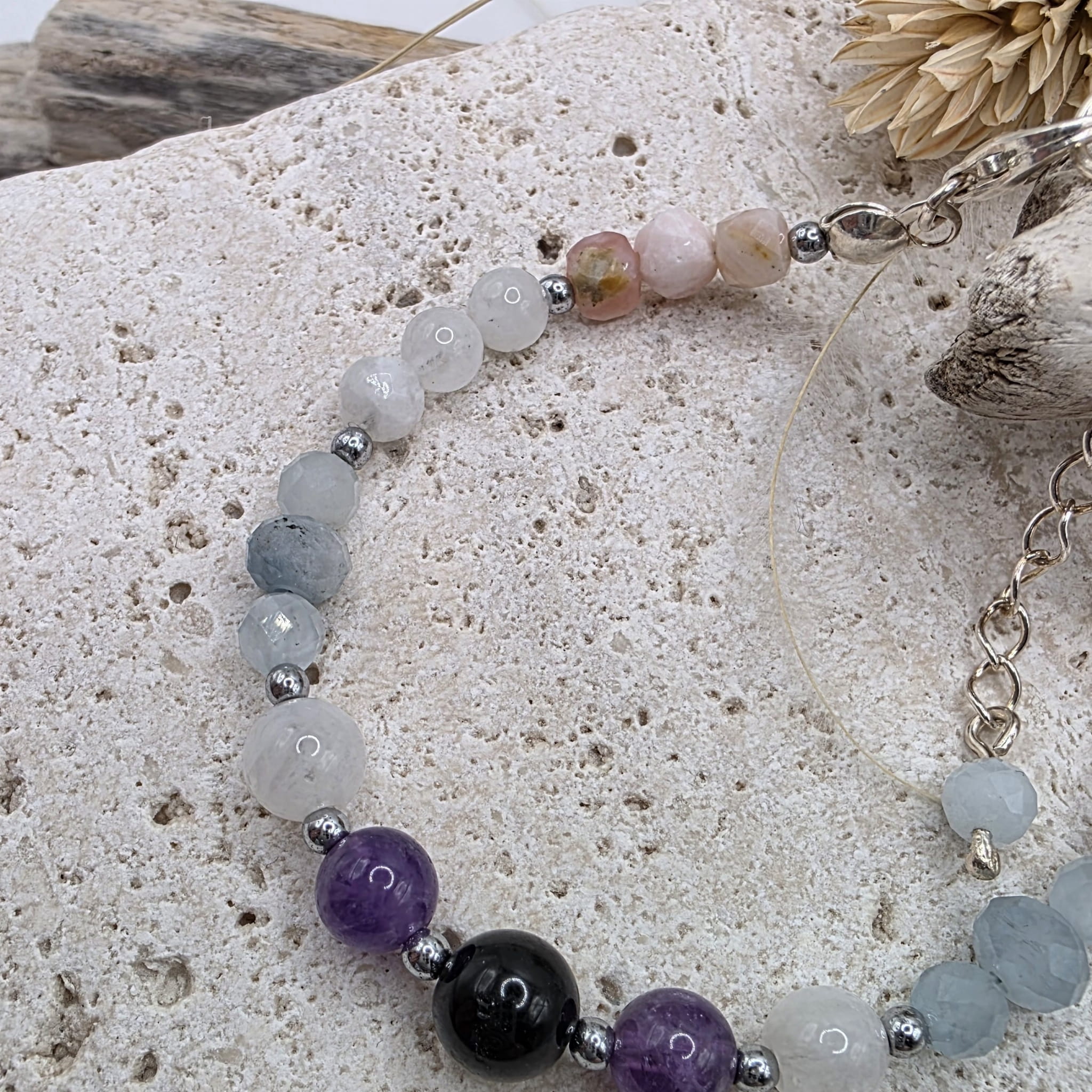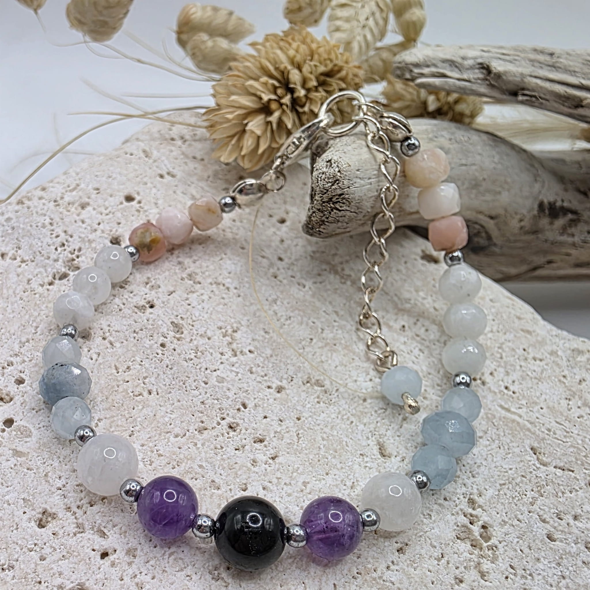 Bransoletka dla zodiakalnych Ryb z kamieni naturalnych w pastelowych odcieniach z ochronnym czarnym turmalinem w centralnym punkcie