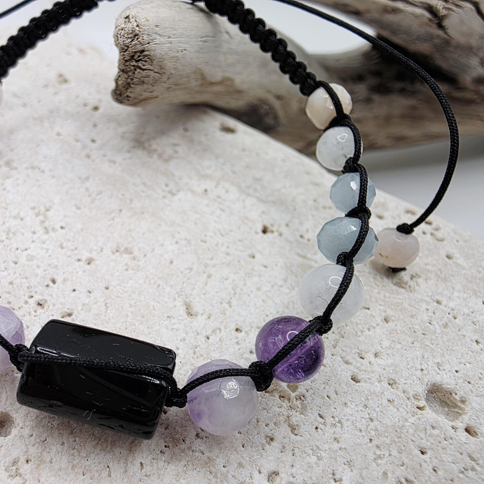 Bransoletka dla zodiakalnych Ryb z kamieni naturalnych w pastelowych odcieniach z ochronnym czarnym turmalinem w centralnym punkcie wesprze ten znak na różnych etapach życia