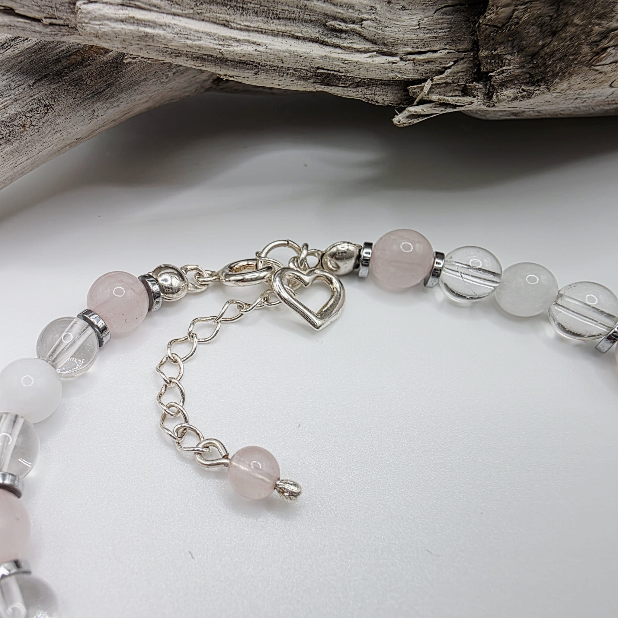 Kamienie, z których wykonana jest bransoletka mają średnicę około 6 mm. Okucia, łańcuszek - przedłużka oraz zawieszka - serduszko wykonane są ze srebra pr. 925.