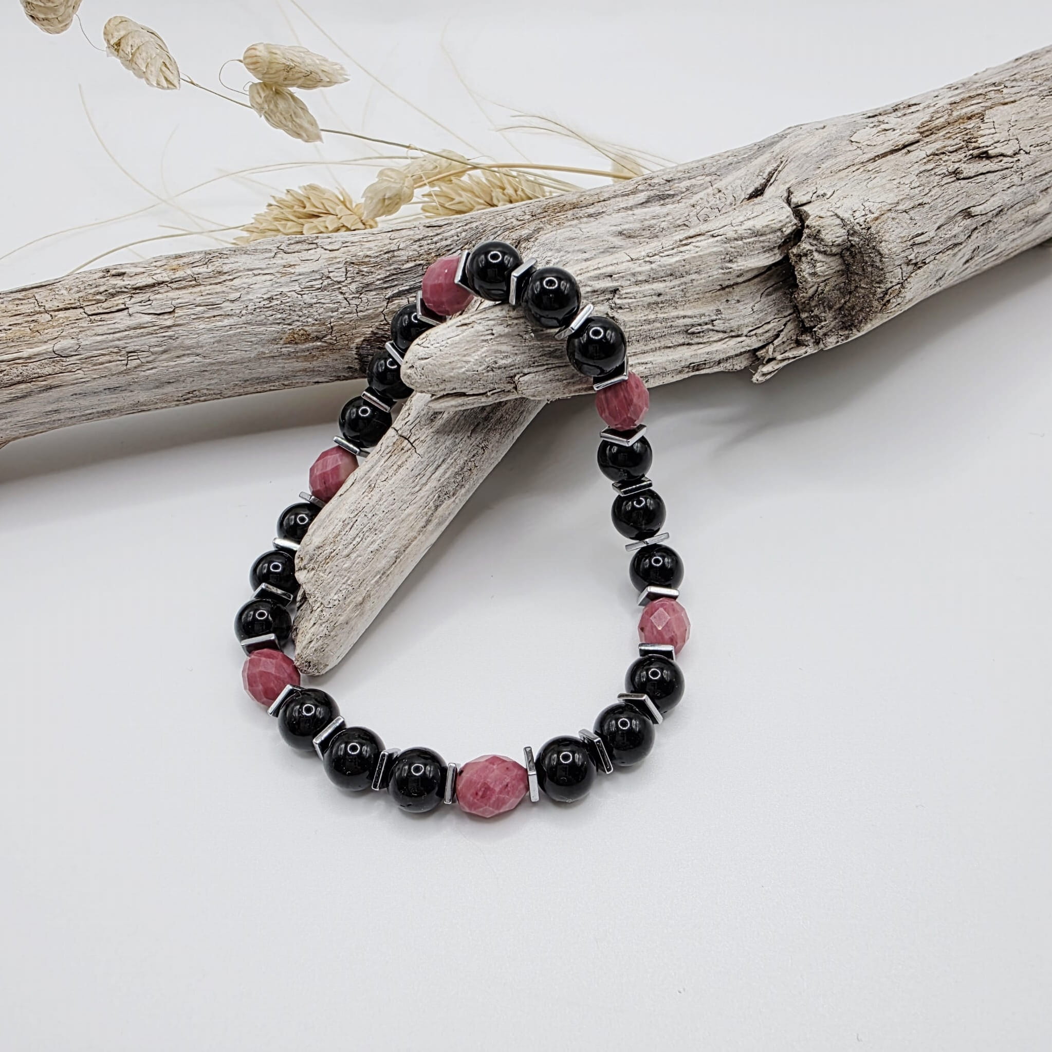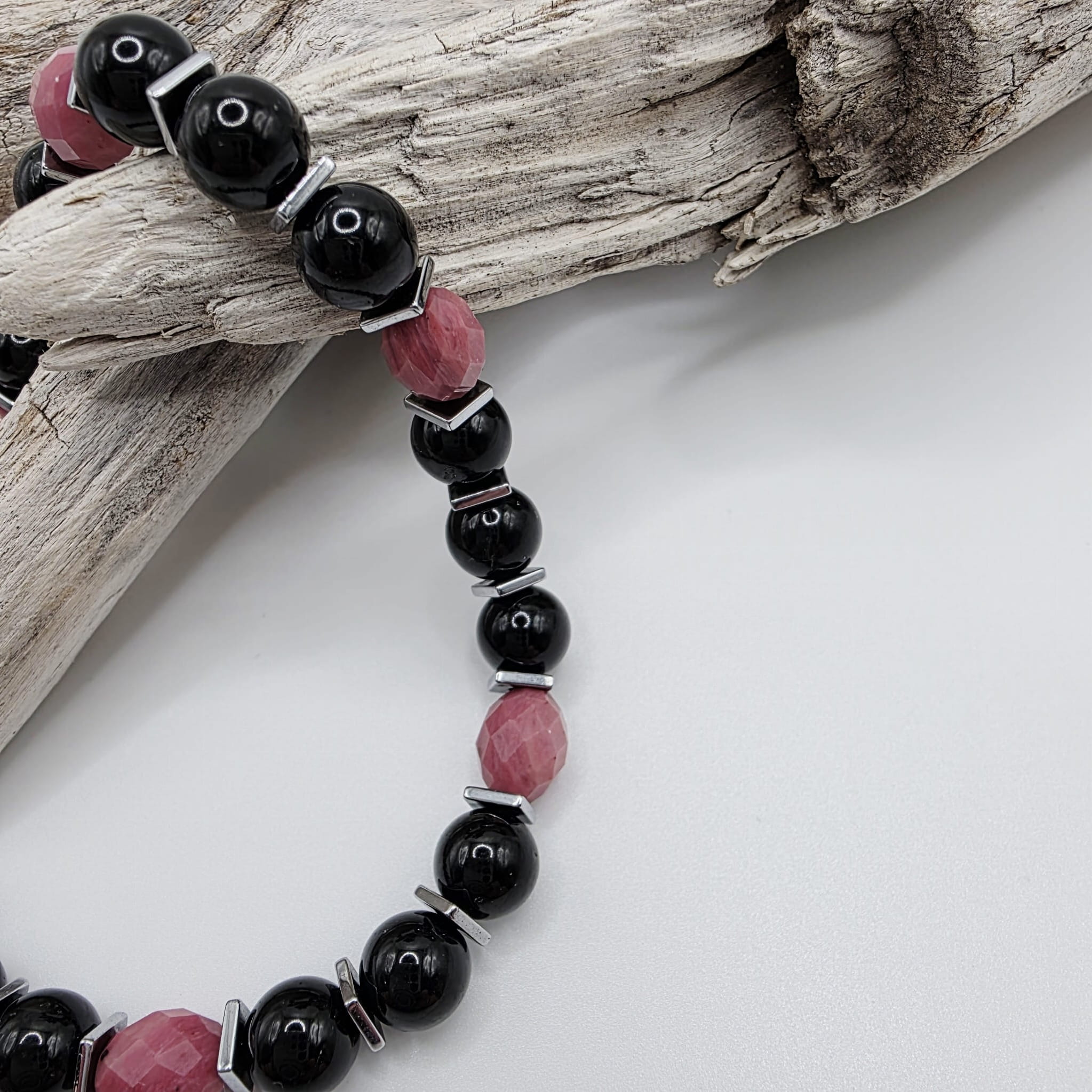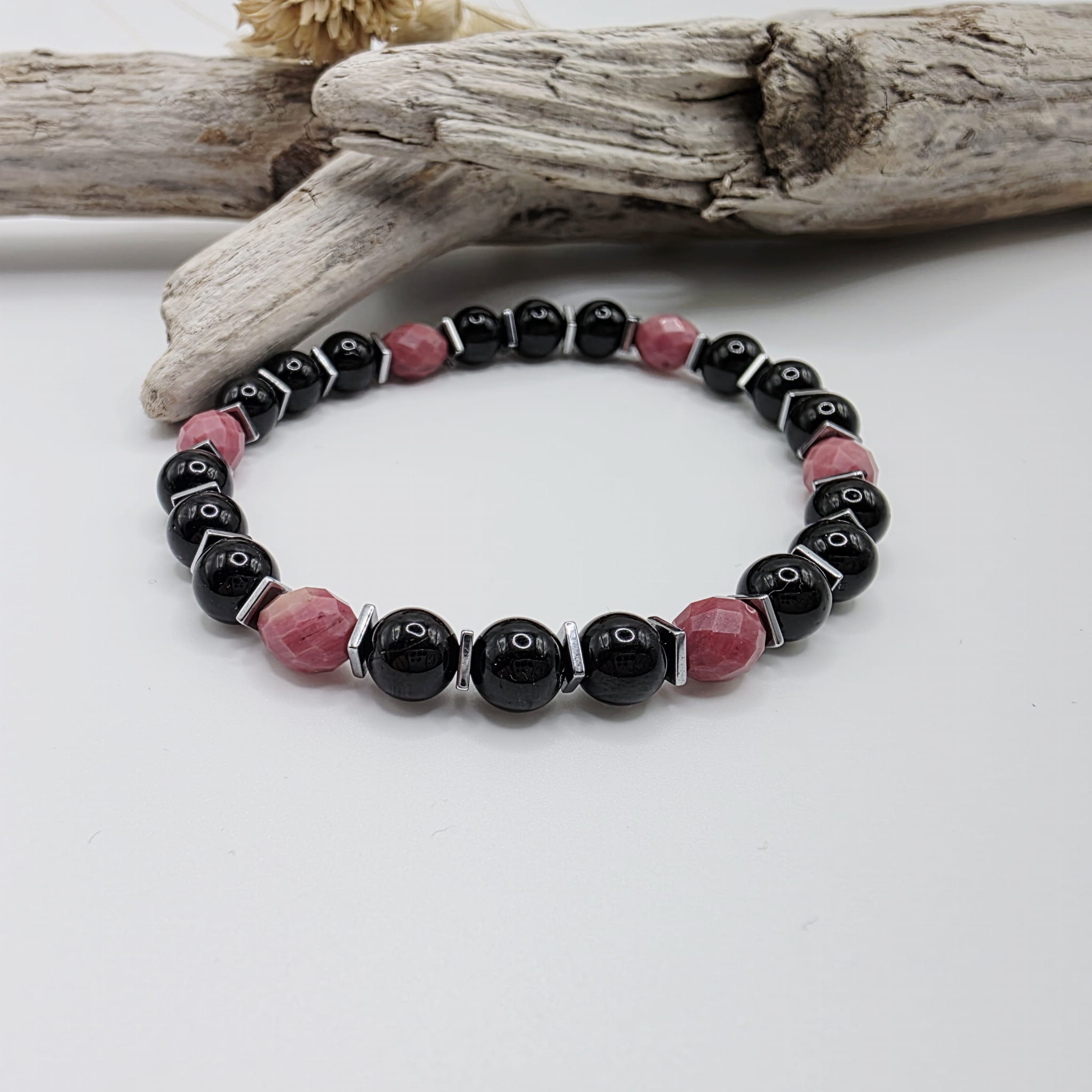 Wyjątkowa bransoletka z kamieni naturalnych - czarnego turmalinu i różowego rodonitu przeplatanych srebrnym hematytem - pełna uroku i magicznej niezwykłej mocy: