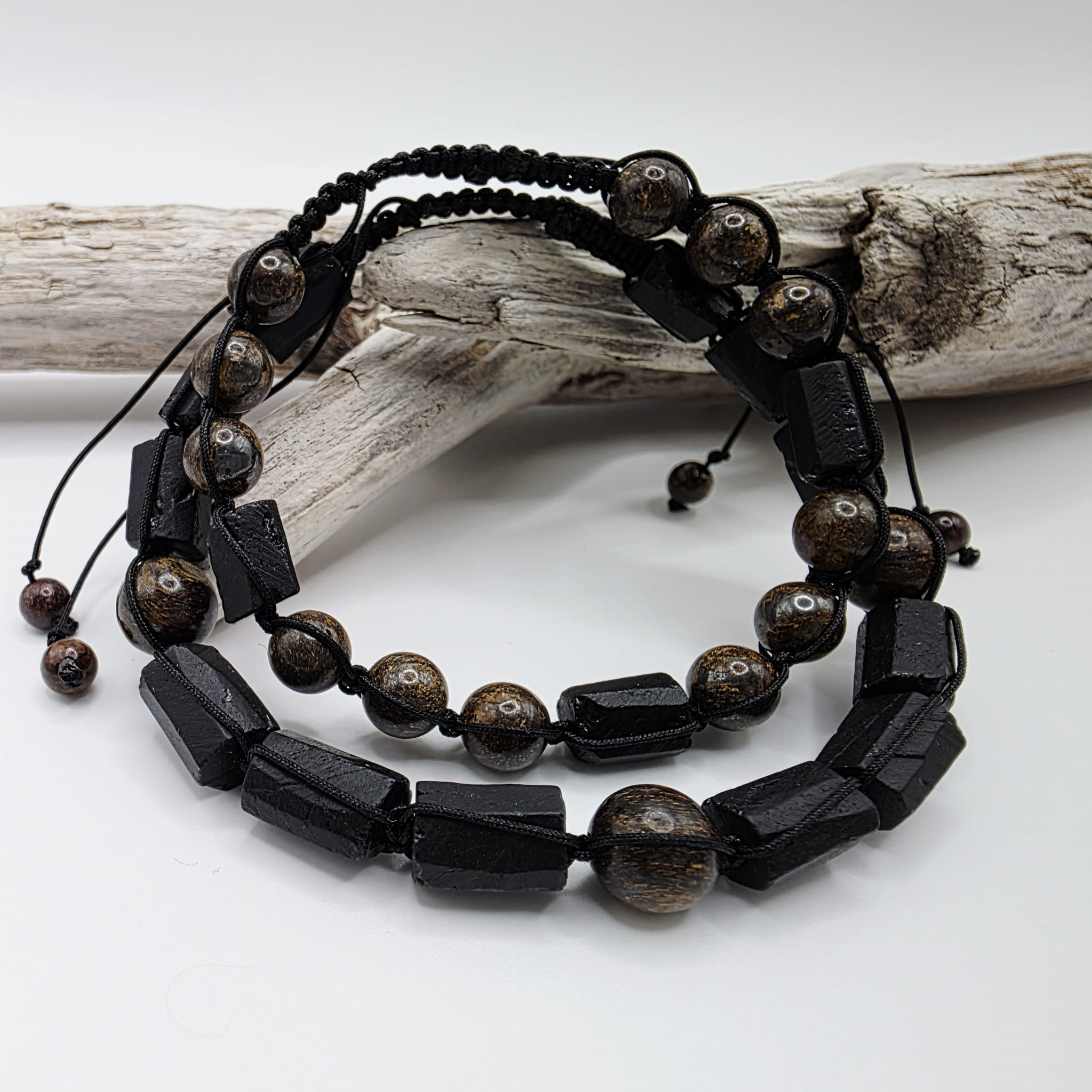 W bransoletkach męskich czarny turmalin jest kamieniem dominującym, w wersji kobiecej jest więcej koloru. Bransoletki plecione są na sznurku, mają uniwersalny rozmiar: