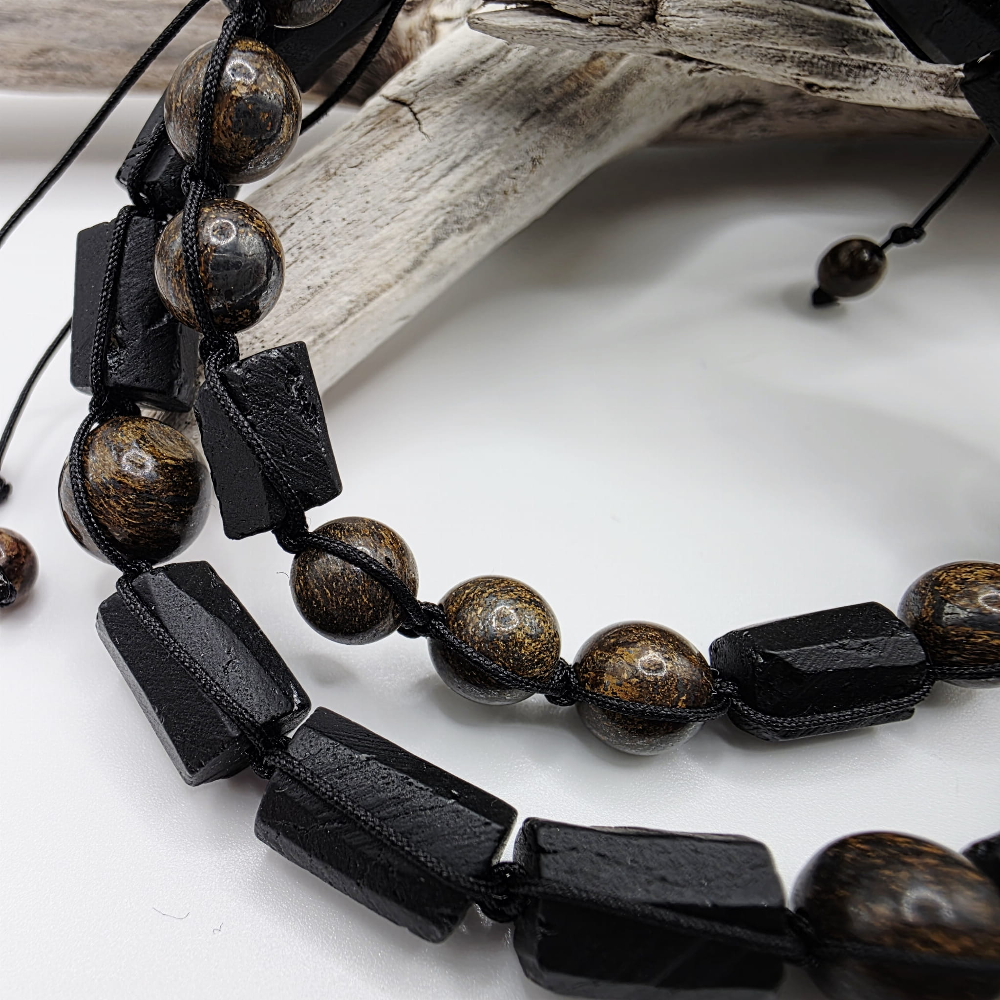 Bransoletki dla dwojga z nieregularnych bryłek czarnego turmalinu i bronzytu - magiczna moc zaklęta w kamieniach, doskonały prezent dla każdej pary