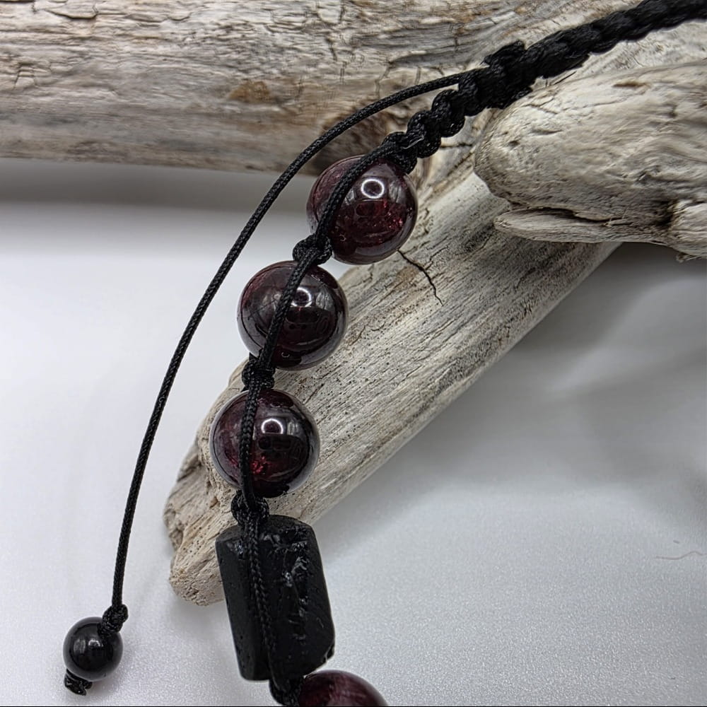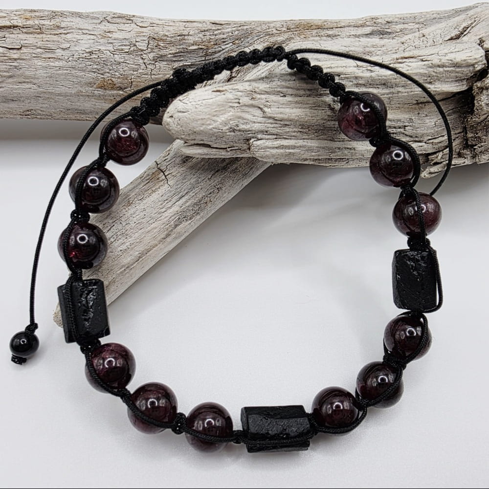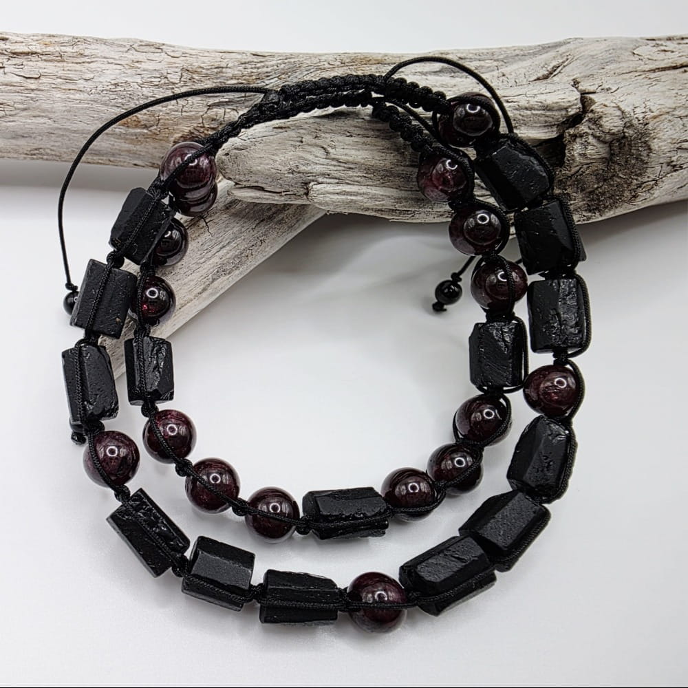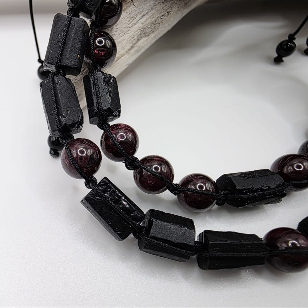 Bransoletki dla dwojga z nieregularnych bryłek czarnego turmalinu i granatu - magiczna moc zaklęta w kamieniach, doskonały prezent dla każdej pary:
