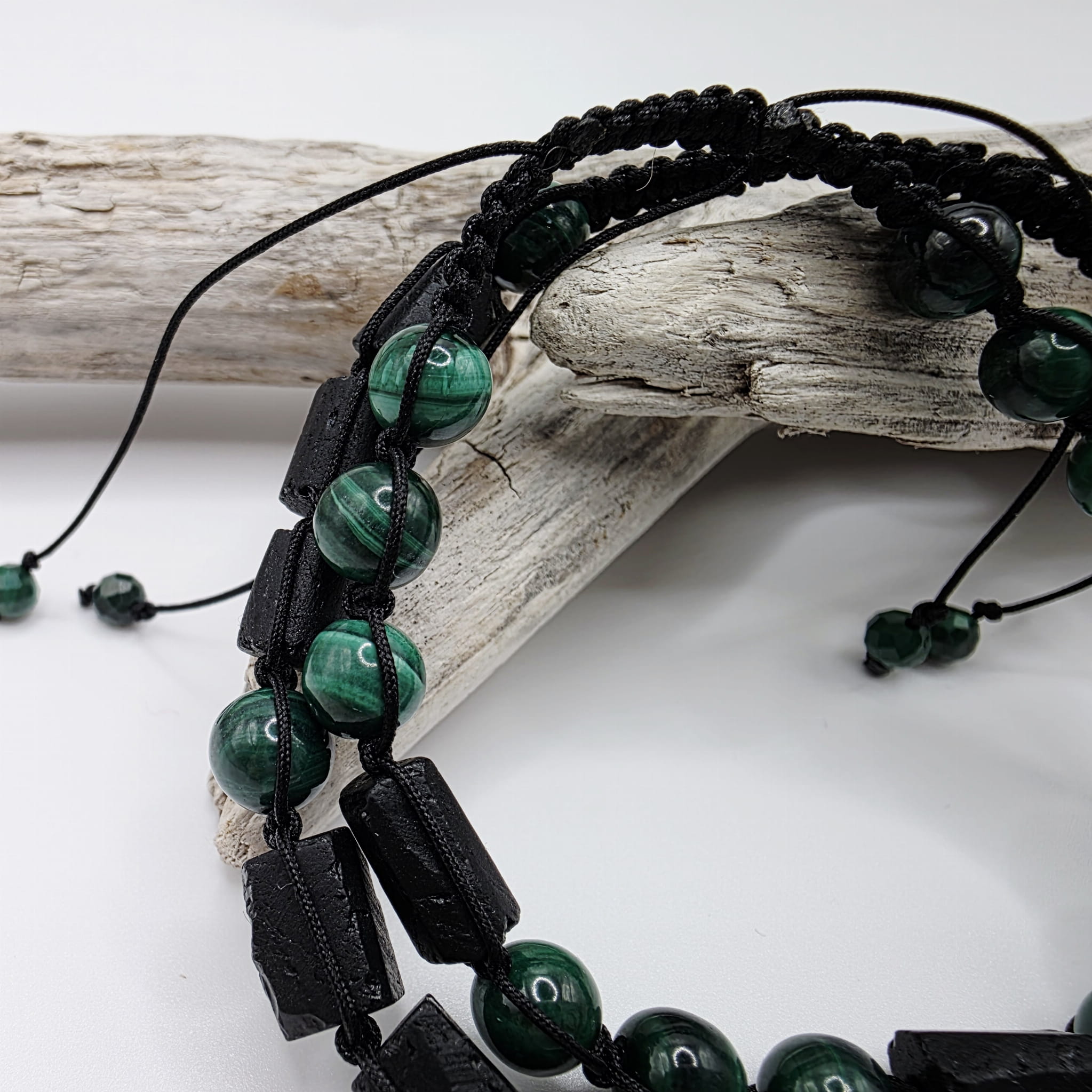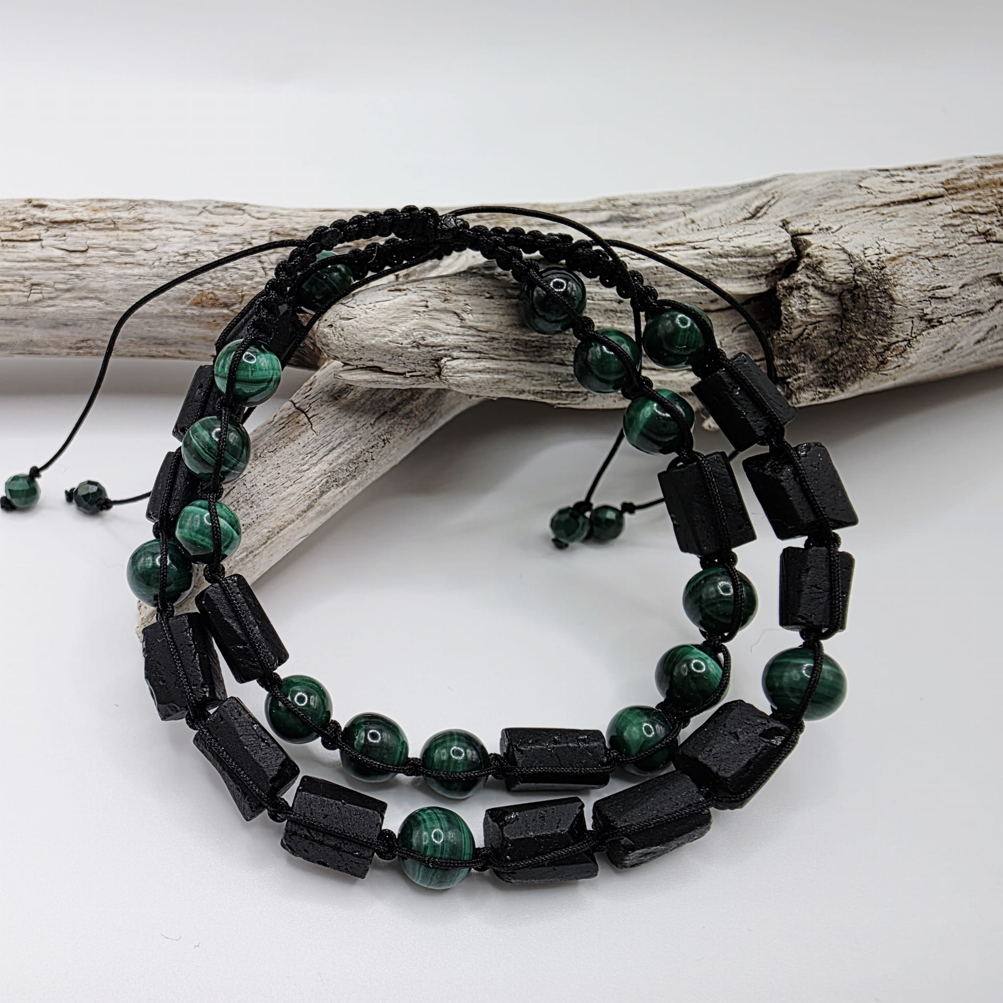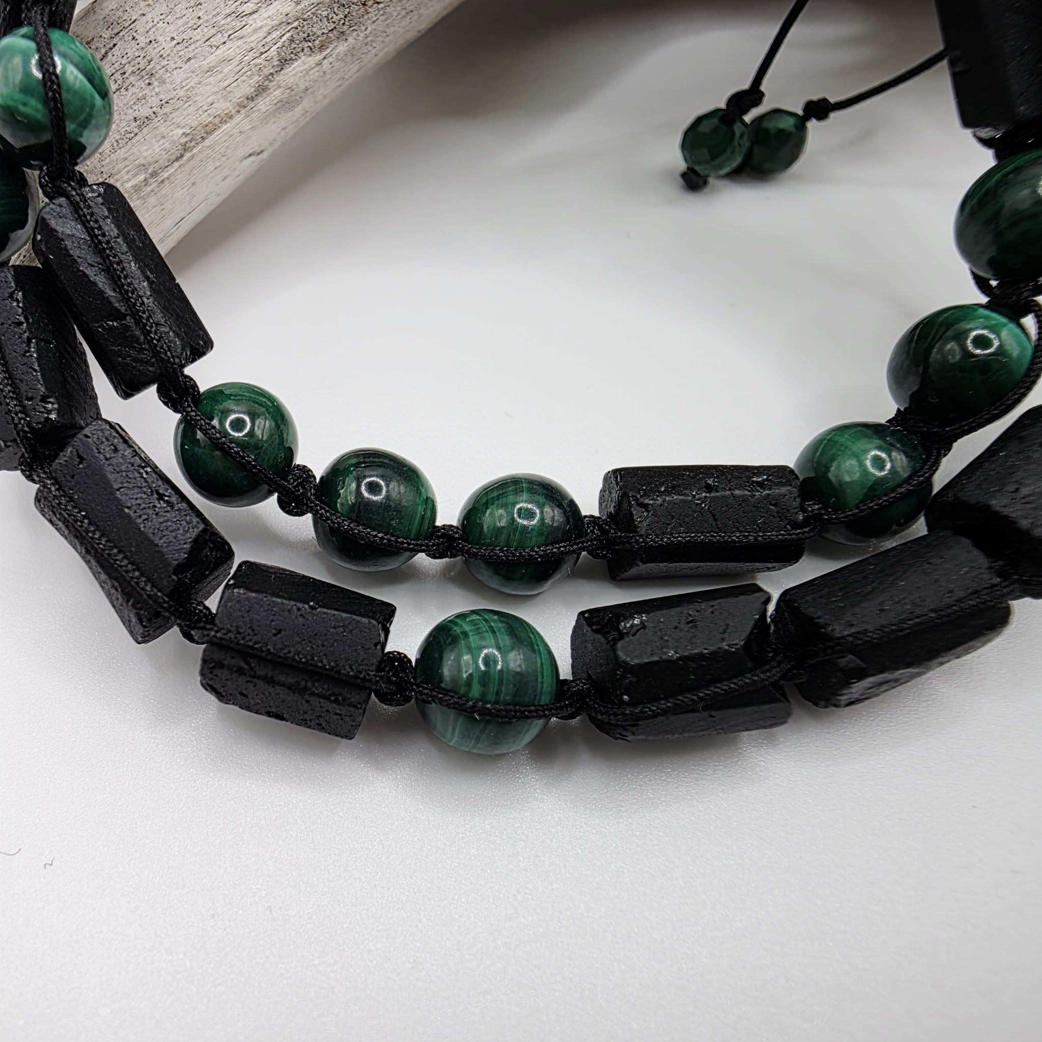 Bransoletki dla dwojga z nieregularnych bryłek czarnego turmalinu i malachitu - magiczna moc zaklęta w kamieniach, doskonały prezent dla każdej pary: