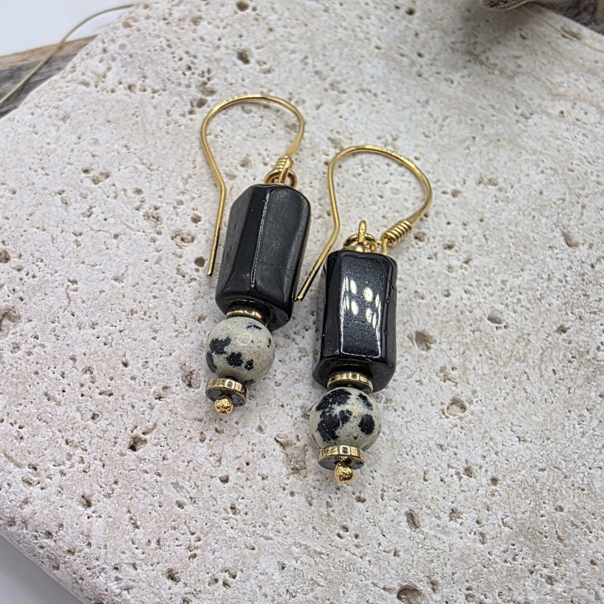 Pełne klasycznej elegancji kolczyki z czarnego turmalinu i jaspisu dalmatyńskiego ze złotymi dodatkami