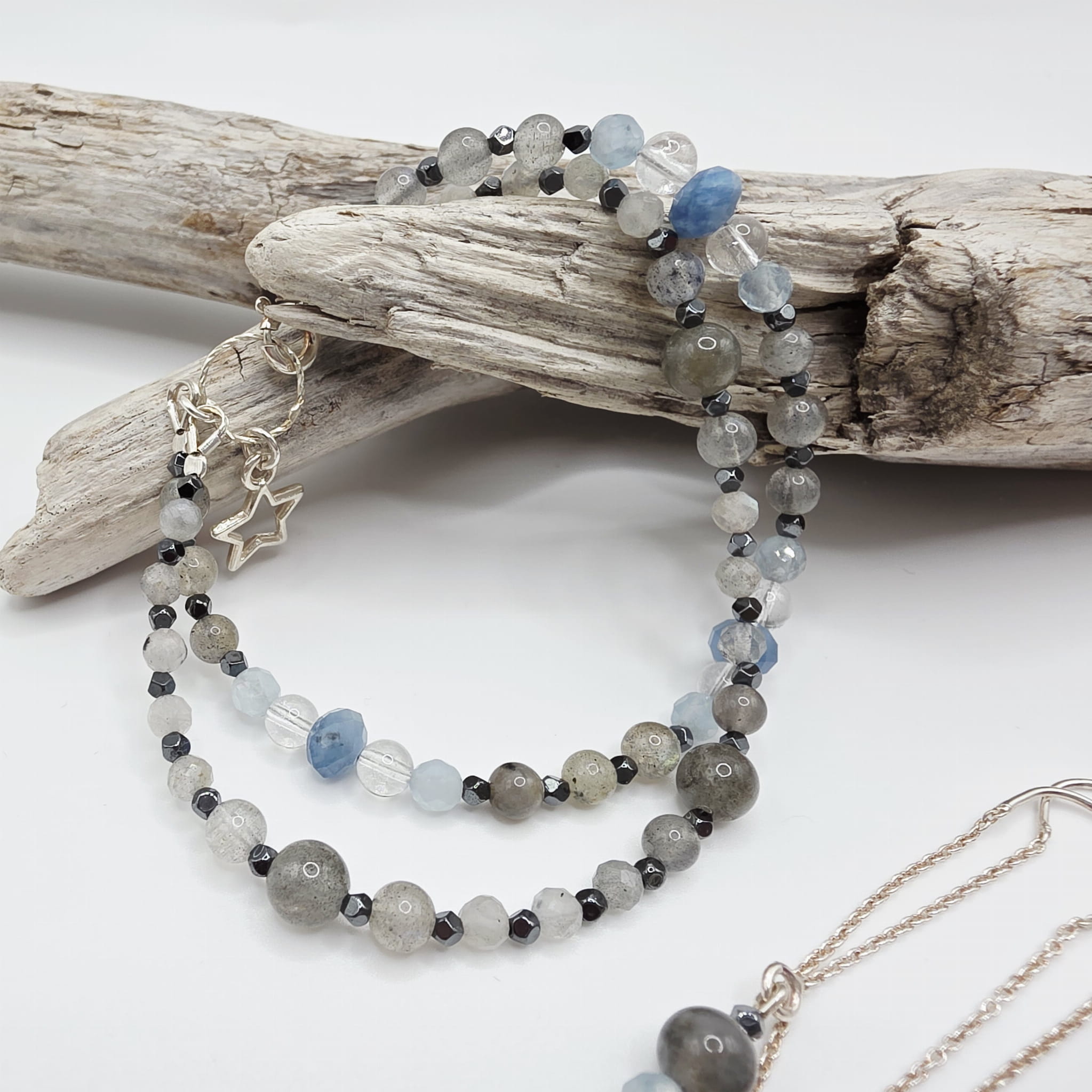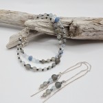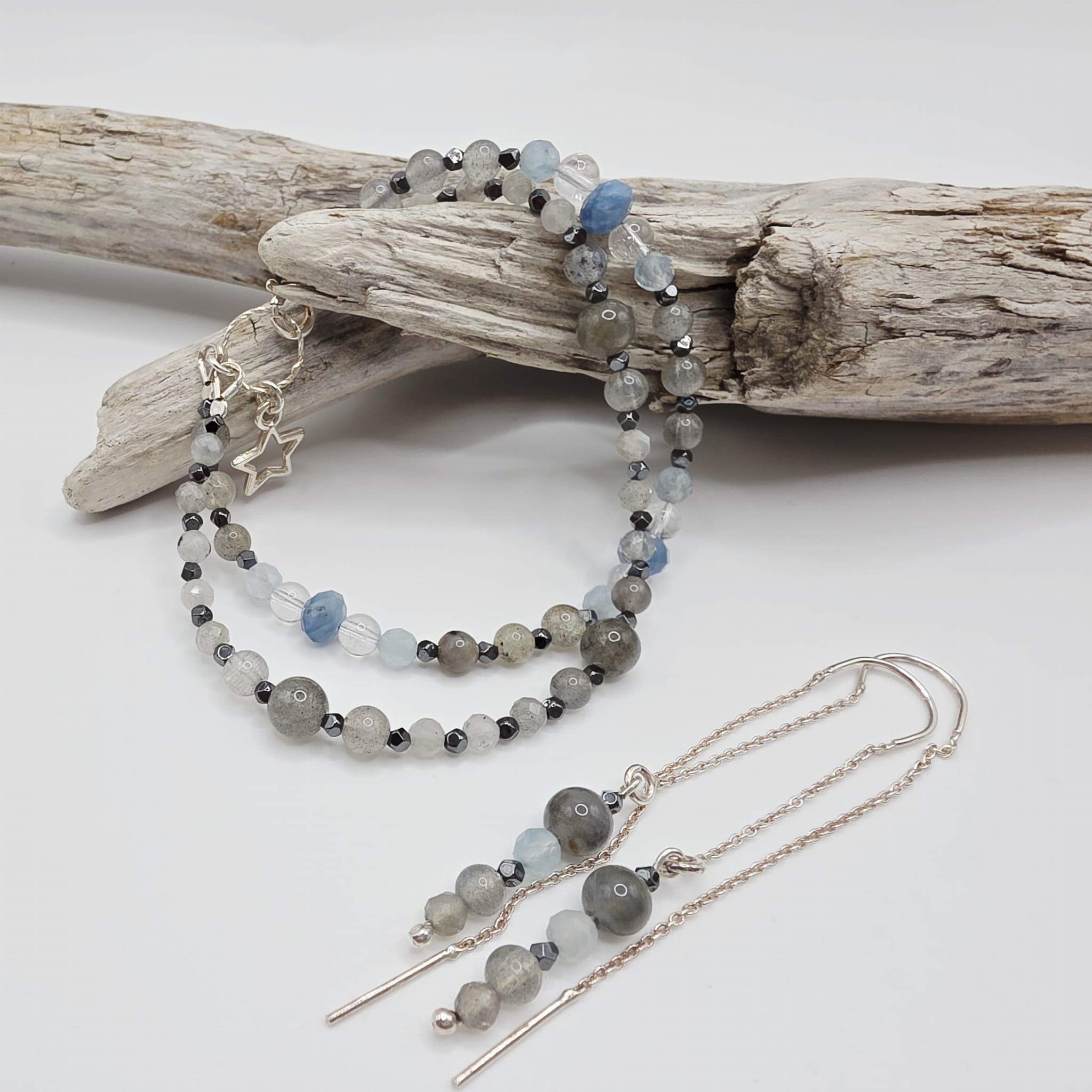 Połączenie labradorytu mieniącego się pięknie odcieniami srebra i błękitu z akwamarynem i kryształem górskim w podwójnej bransoletce i długich łańcuszkowych kolczykach: