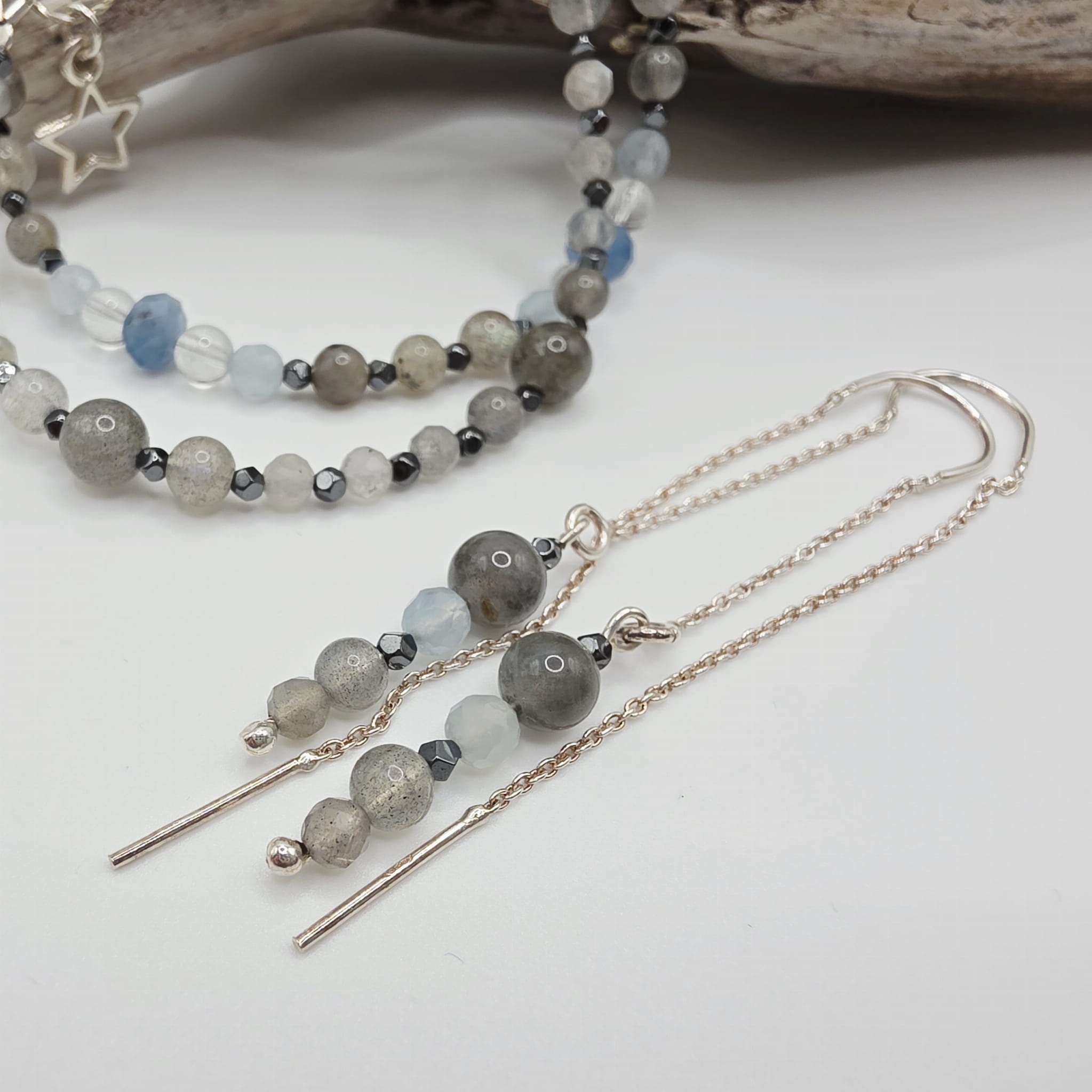 Połączenie labradorytu mieniącego się pięknie odcieniami srebra i błękitu z akwamarynem i kryształem górskim w podwójnej bransoletce i długich łańcuszkowych kolczykach