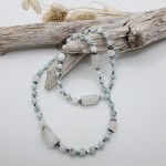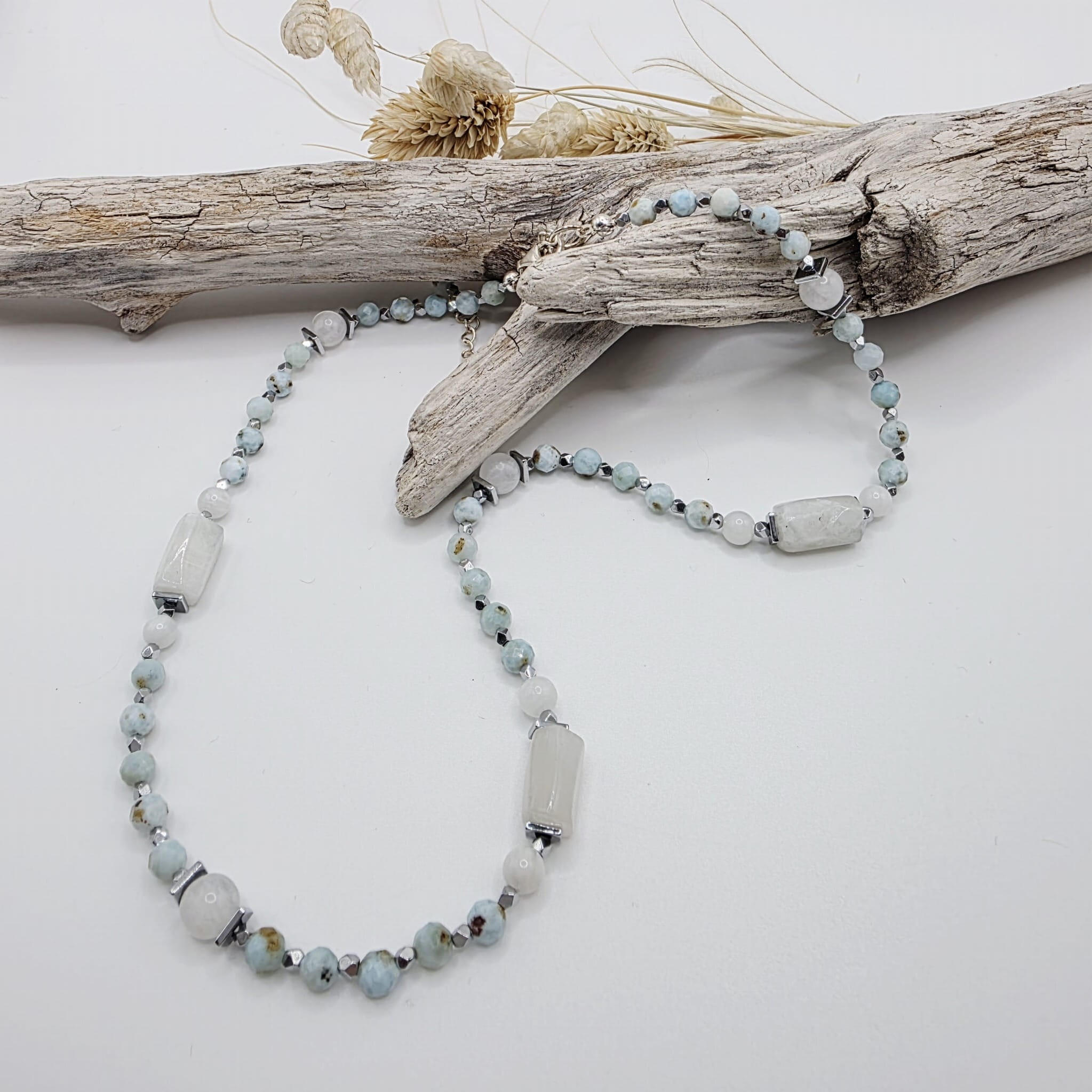 Delikatny naszyjnik z kamieni naturalnych - larimaru i kamienia księżycowego z dodatkiem srebrnego hematytu prezentuje się przepięknie: