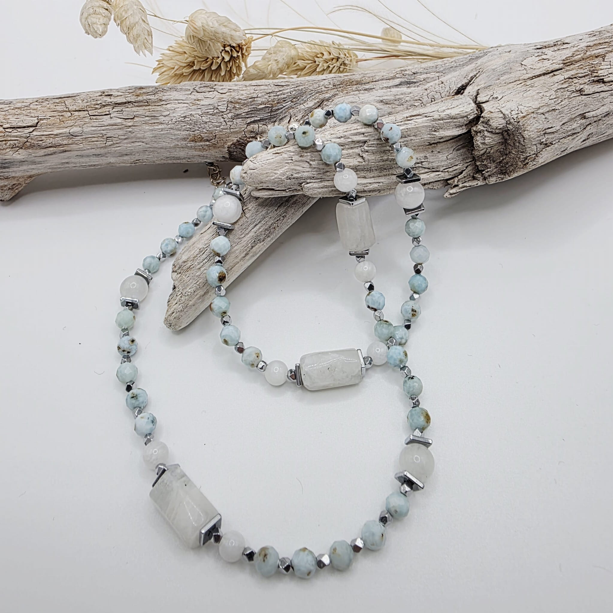 Delikatny naszyjnik z kamieni naturalnych - larimaru i kamienia księżycowego z dodatkiem srebrnego hematytu